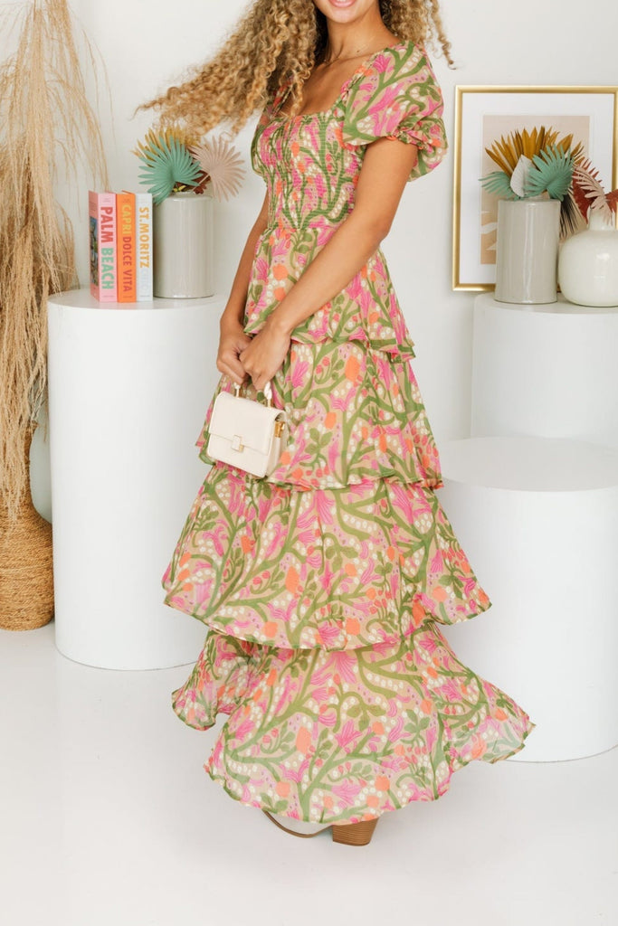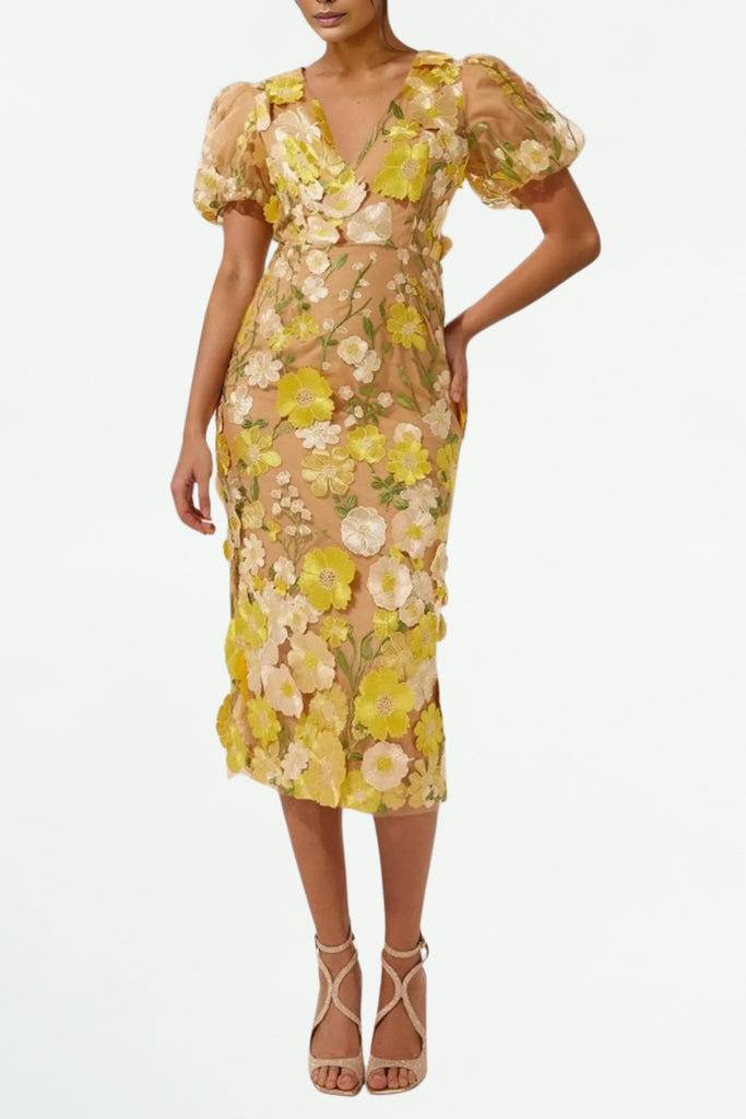 EREEN PUFF SLEEVES V-NECK FLOWER MIDI DRESS