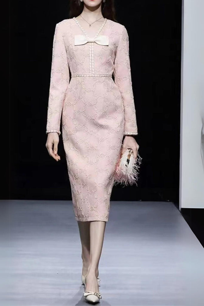 EMBROIDERED V-NECK BOW MIDI DRESS