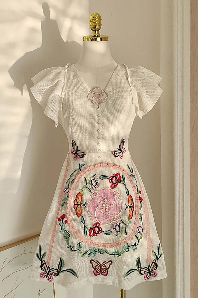 FAWN FLOWER EMBROIDERY BUTTON MINI DRESS IN PINK