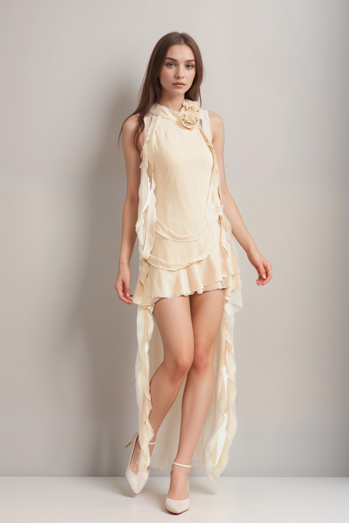 elva halter three-dimensional flower irregular tassel mini dress in Beige
