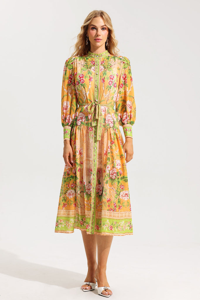 Floral Bottom Lantern Sleeve Midi Dress With Belt