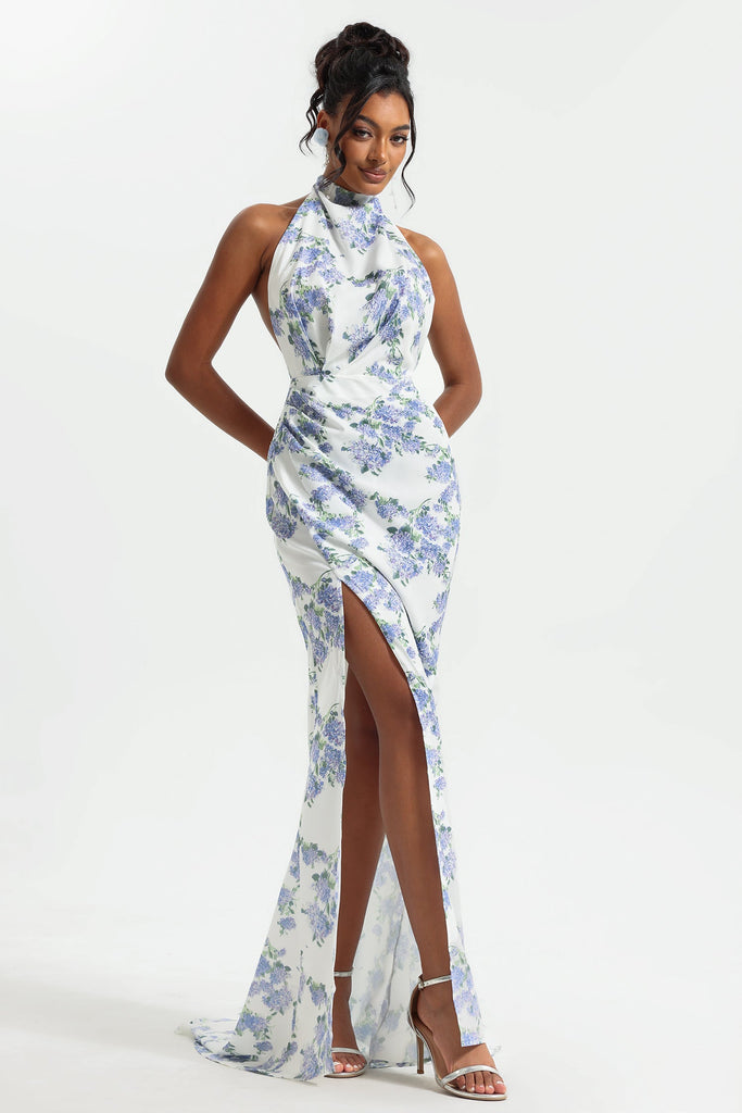 Floral Halter Ruffle Tulle Maxi Dress in Blue