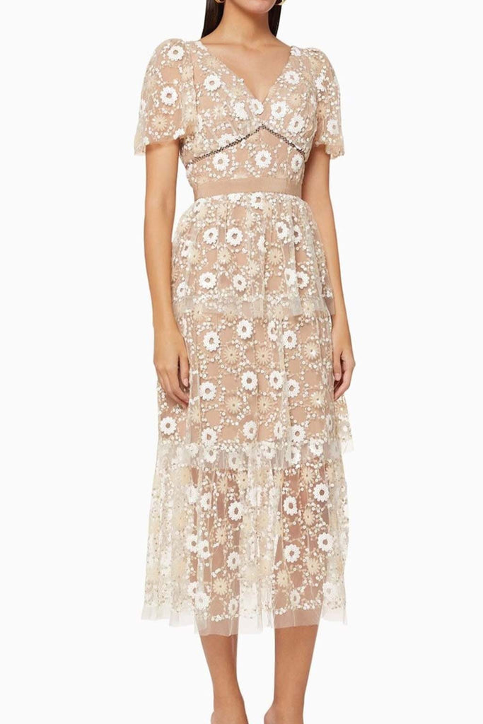 FLORAL EMBELLISHED MIDI DRESS IN WHITE