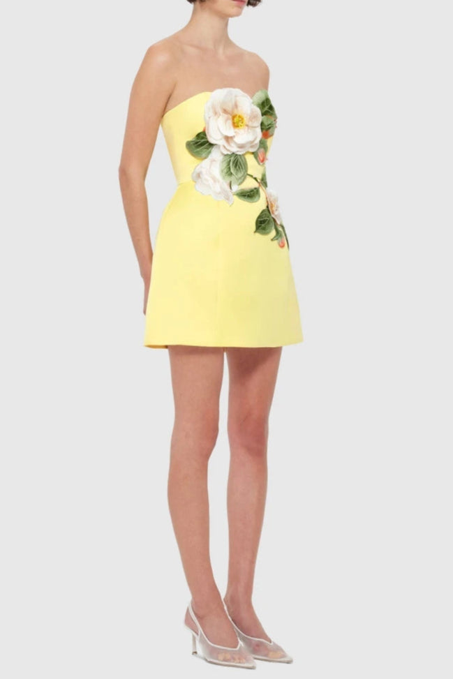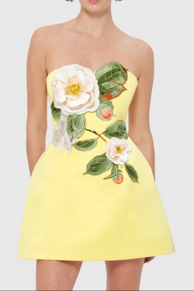 The Suzanne Appliqué Floral Bustier Mini Dress in yellow combines delicate floral appliqué detailing with a structured bustier silhouette, offering a refined yet playful look. Its vibrant yellow hue enhances the dress’s fresh, summery appeal, while the mini length adds a modern, youthful edge. Ideal for occasions that call for elegance with a touch of whimsy, this dress balances intricate craftsmanship and flattering design to elevate your wardrobe.