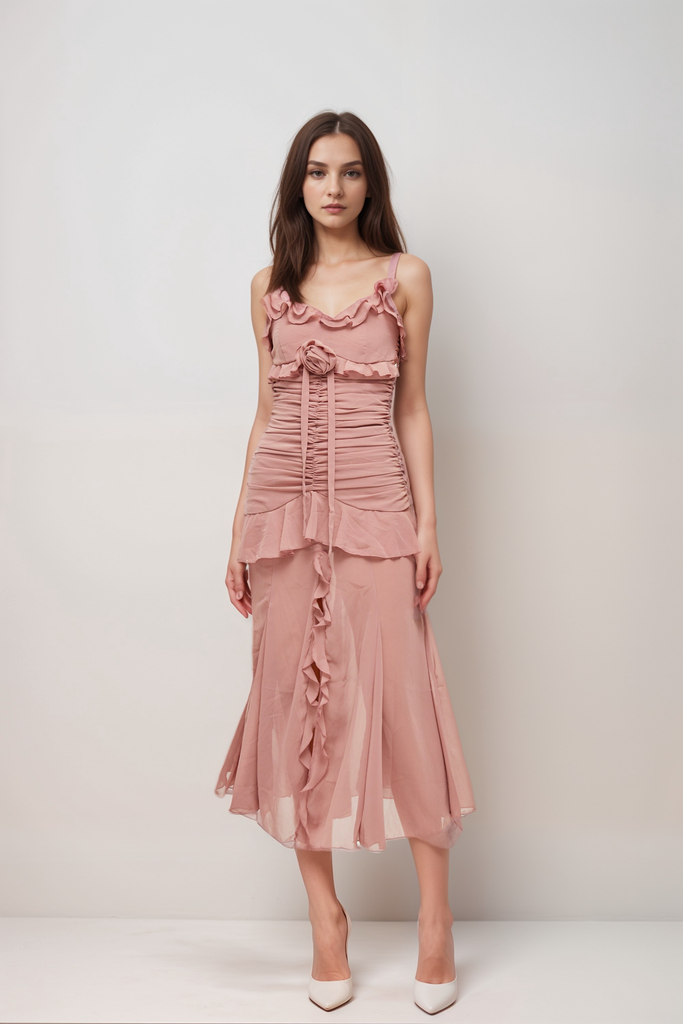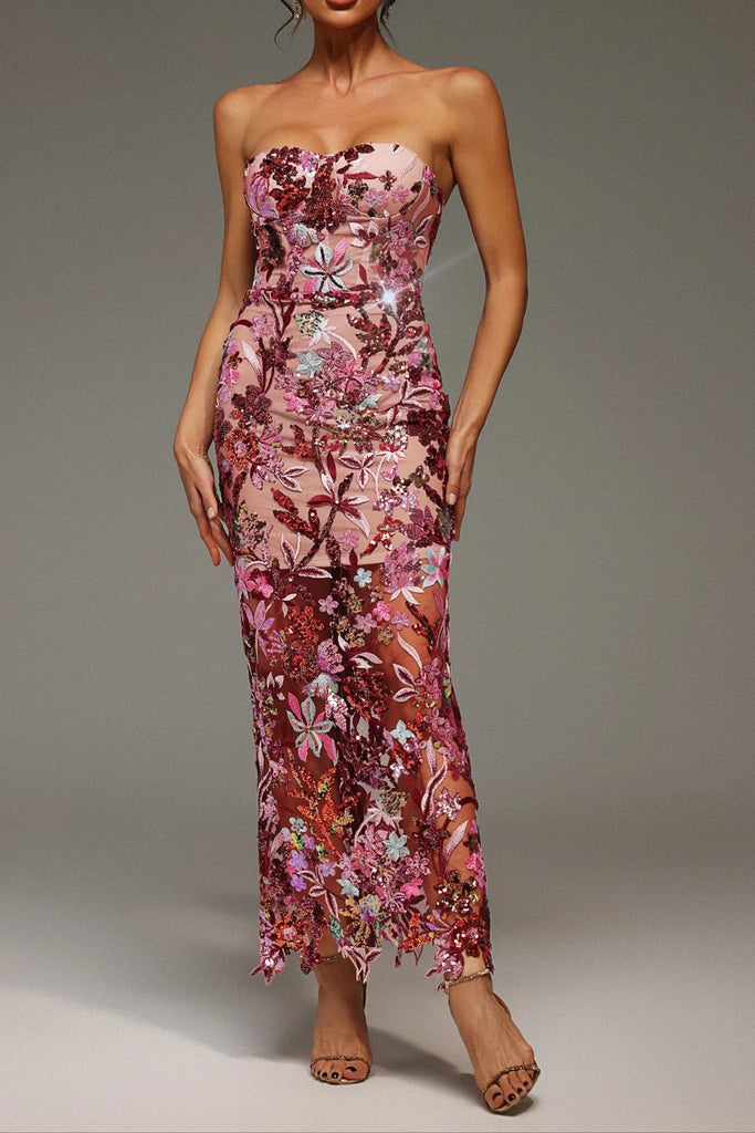 CHACHI PINK STRAPLESS FLOWER EMBROIDERY MAXI DRESS