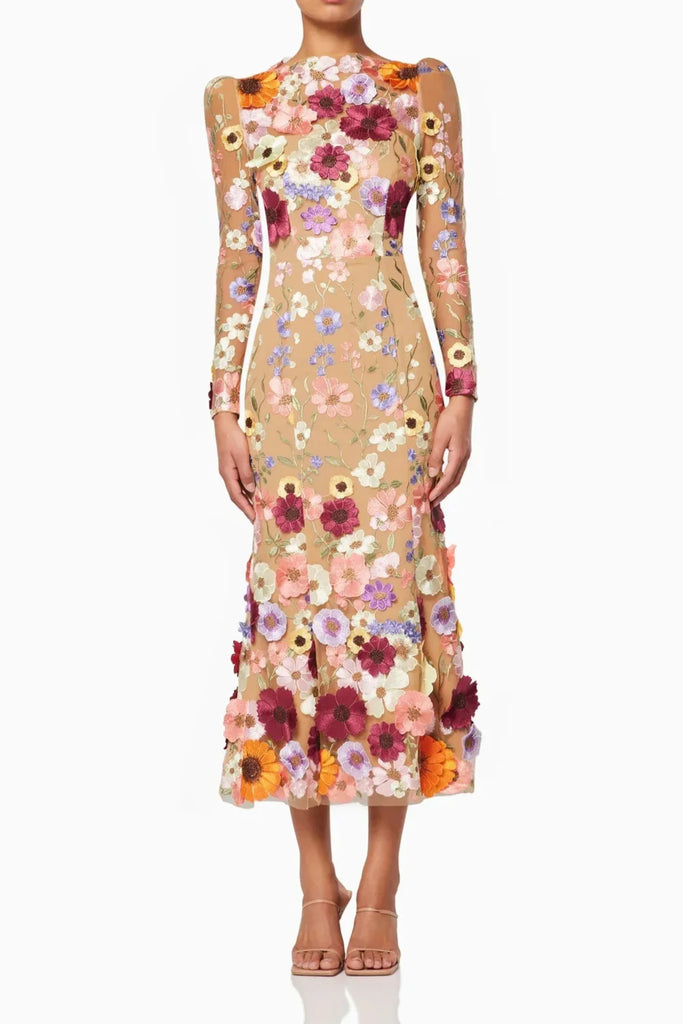 EMBROIDERY LACE LONG SLEEVE MIDI DRESS IN WHITE