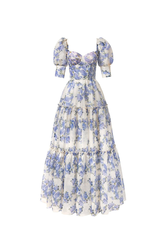 Hydrangea print Voluminous Sleeves maxi Dress in blue – Wildnora.com