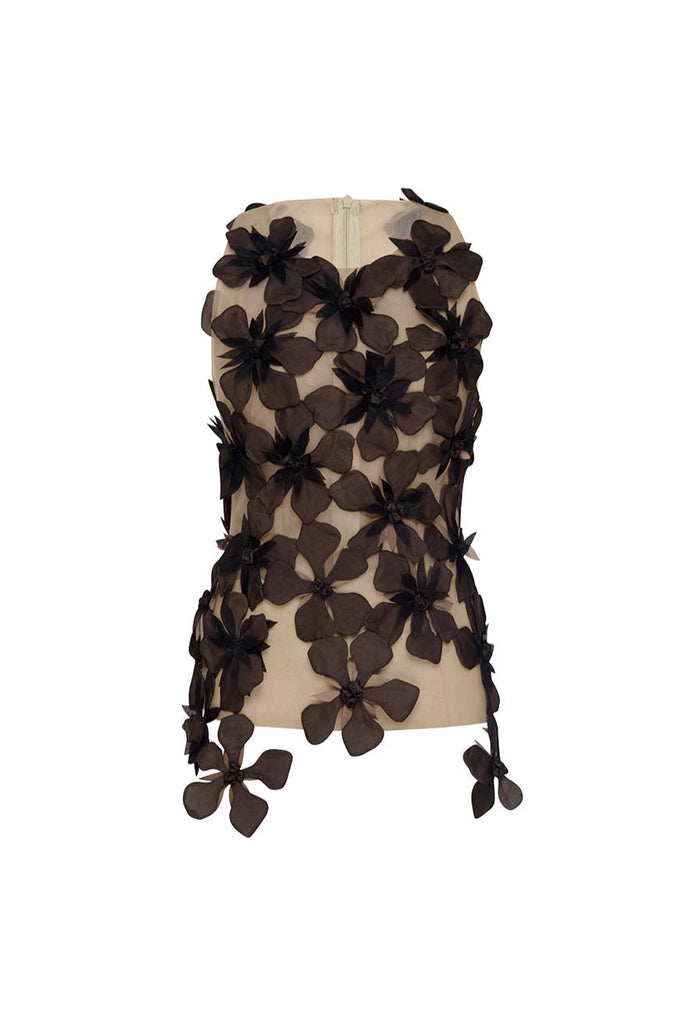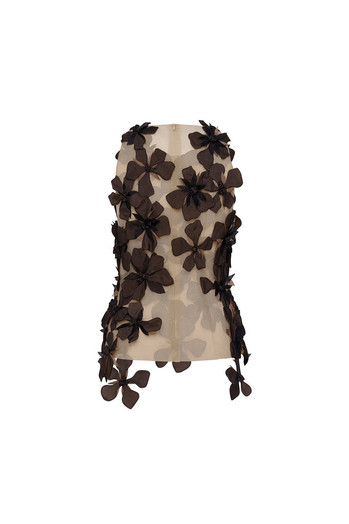 This sophisticated piece combines a sleek bodycon silhouette with delicate flower appliques on tulle overlay, creating a perfect balance of elegance and edge. The versatile black colorway ensures seamless integration with existing pieces while offering a refined aesthetic suitable for both evening events and elevated casual settings.