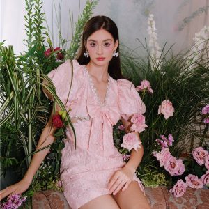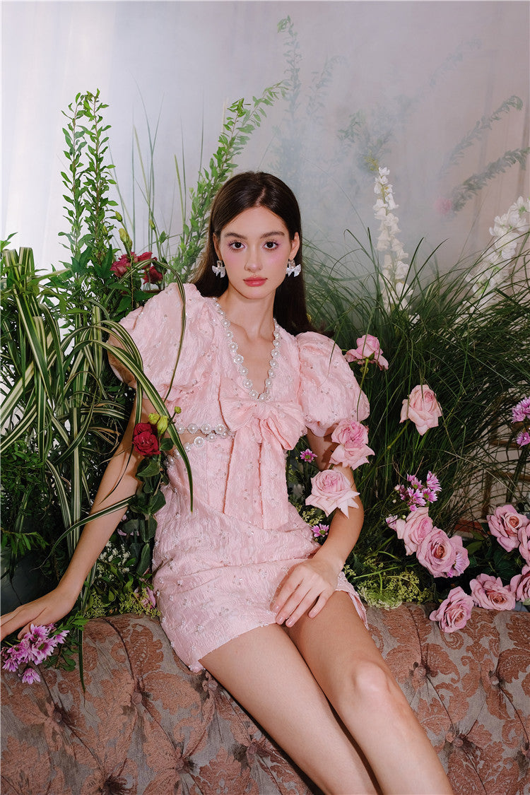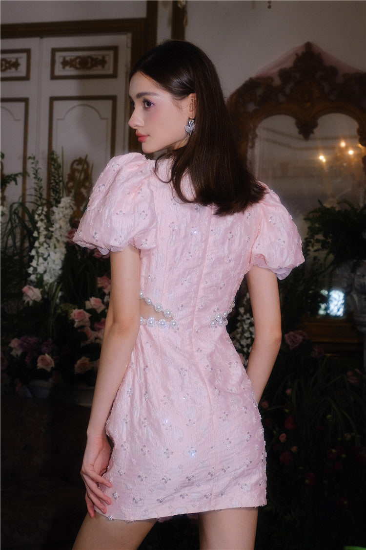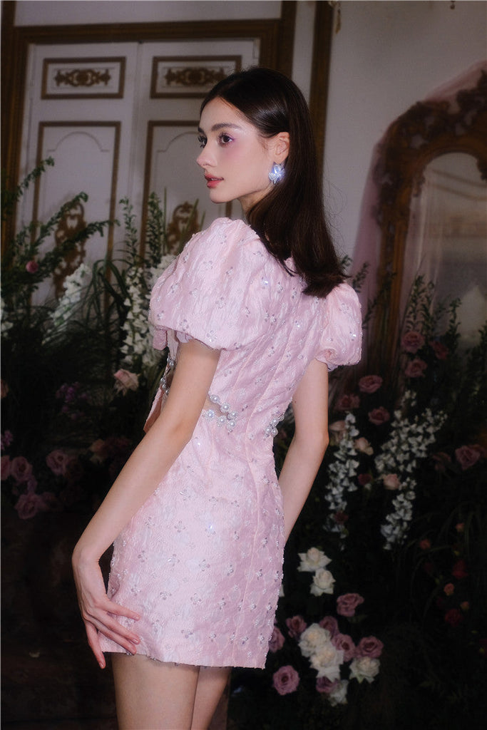 Pearl Diamond Decorated Bubble Sleeve Jacquard Embroidery Dress – Wildnora.com