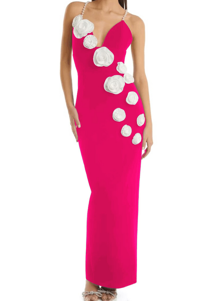 FLOWER PEARL STRAPS MAXI DRESS HOT PINK