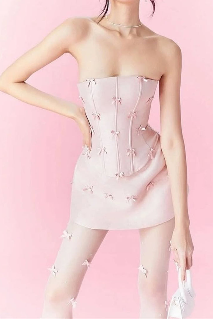 PINK BOW EMBELLISHED STRAPLESS MINI DRESS SET