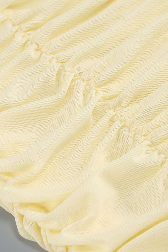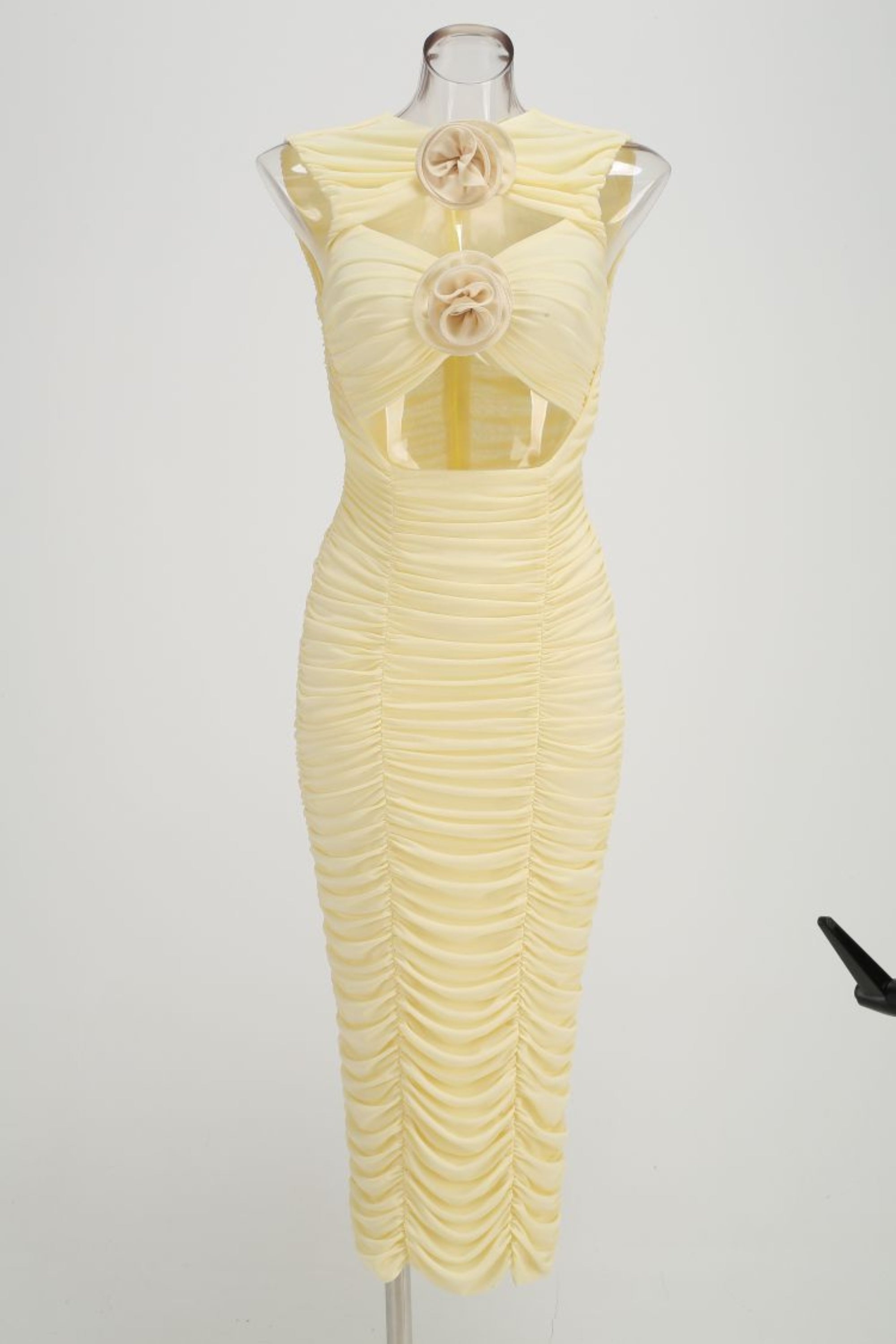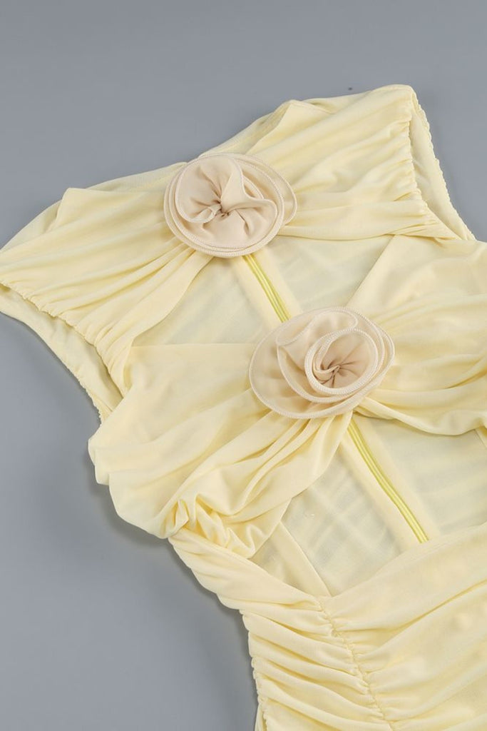 Sapientemente realizzato in delicato tulle, questo abito midi giallo presenta intricati ritagli floreali che aggiungono un tocco di eleganza. Il tessuto fluido e leggero crea una silhouette meravigliosa, donandoti sicurezza e femminilità. Perfetto per qualsiasi occasione o evento speciale.