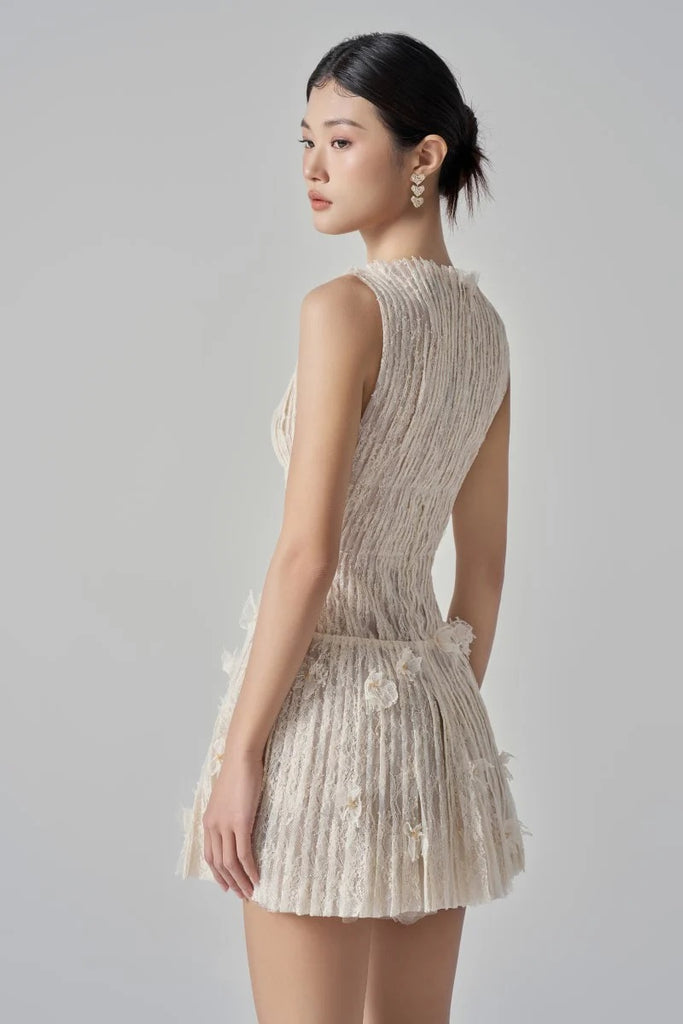 Con una morbida gonna a trapezio e uno strato inferiore in tulle per un volume extra, l'abito scivola con grazia, offrendo una silhouette leggera e lusinghiera. La lunghezza mini gli conferisce un tocco giovanile ed elegante, rendendolo ideale per le occasioni speciali. Questo abito combina pizzo delicato, intricati dettagli floreali e una silhouette aggraziata per creare un look chic e disinvolto, fresco e romantico, perfetto per chi desidera uno stile sofisticato ma giocoso.