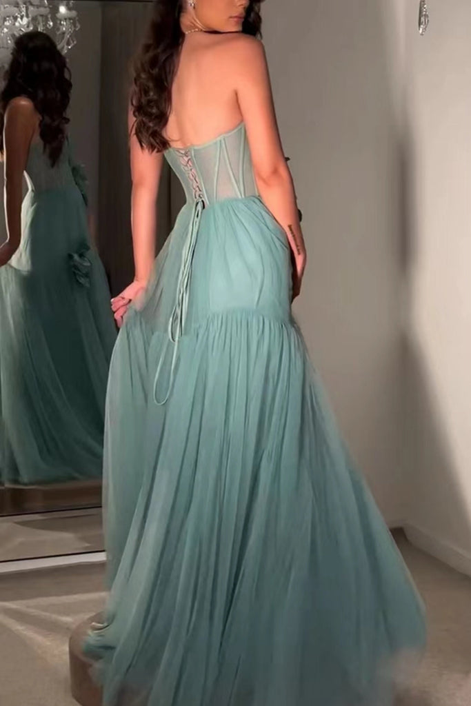 Esalta il tuo guardaroba con il nostro abito lungo in tulle senza spalline a fiori blu. Incarna eleganza e grazia con questo splendido capo, caratterizzato da una delicata stampa floreale e da un seducente design senza spalline. Realizzato in tulle di alta qualità, questo abito ti farà apparire e sentire al meglio.