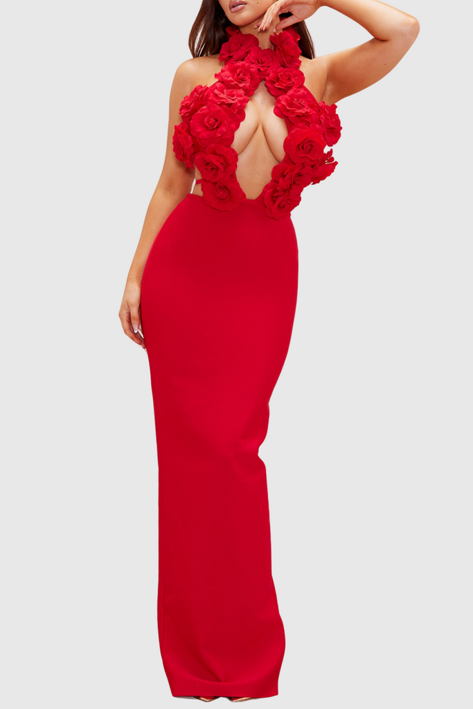 abito lungo con spalline e fiori 3D Winifred in rosso