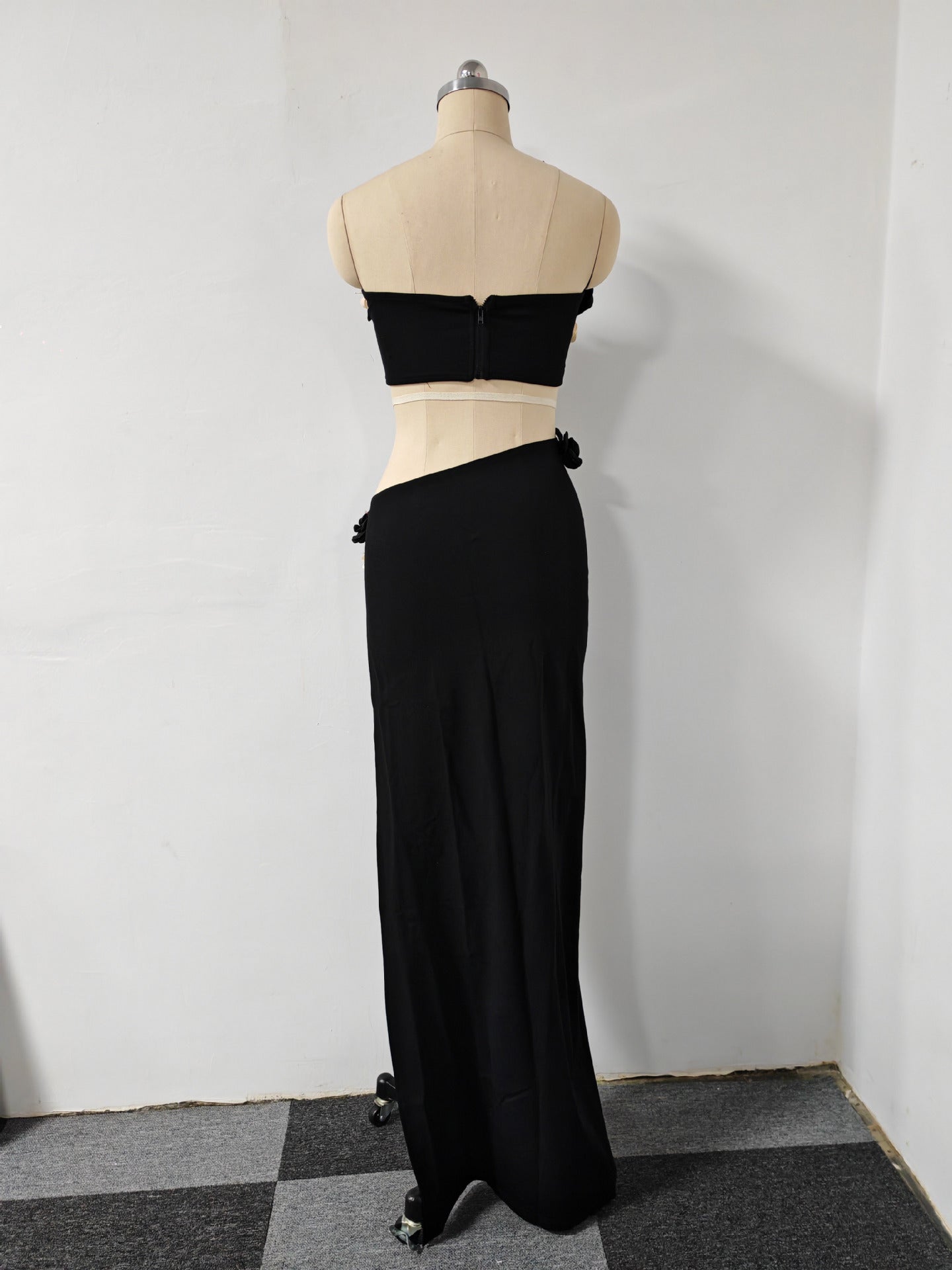 Esalta il tuo guardaroba da sera con questo maxi completo nero senza spalline, caratterizzato da un audace spacco profondo per una silhouette sorprendente. Le intricate applicazioni floreali 3D aggiungono un tocco femminile e strutturato, mentre le eleganti nappe donano un movimento discreto e sofisticato. Progettato per una vestibilità impeccabile, questo completo unisce un tocco classico a dettagli contemporanei, perfetto per eventi formali o incontri di lusso.