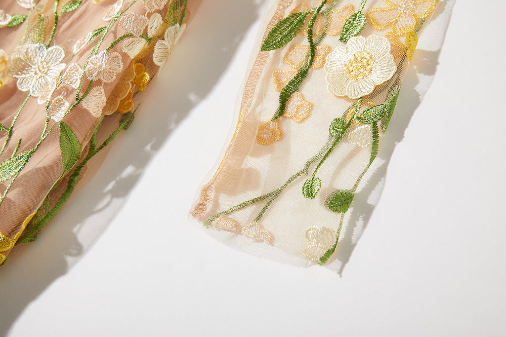 ABITO MIDI A MANICHE LUNGHE IN RETE CON RICAMI FLOREALI GIALLI CAROL