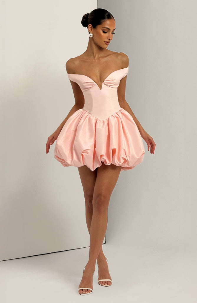 Il mini abito Eileen in rosa cipria è realizzato in taffetà testurizzato con profonda scollatura a cuore e spalline elasticizzate stile Bardot. Il corpetto strutturato presenta stecche interne, completato da una voluminosa gonna a palloncino per una silhouette elegante e raffinata.