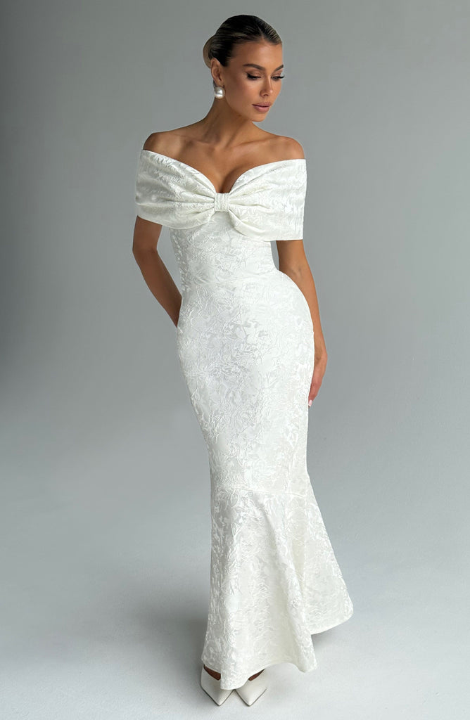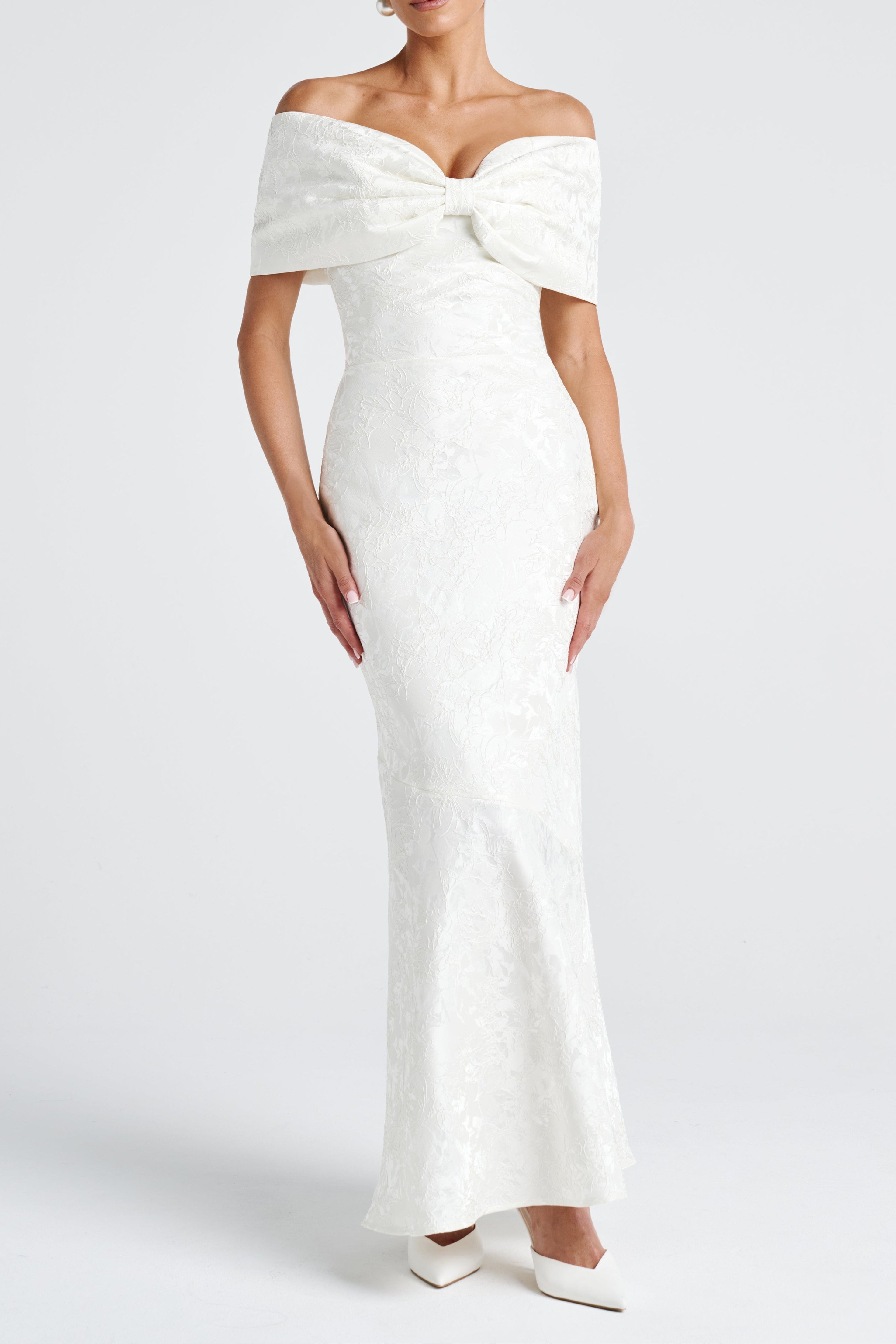 L'eleganza eterea incontra il romanticismo moderno nell'abito lungo Emberly. Progettato per valorizzare ogni angolazione, questo splendido modello dal taglio sbieco accarezza le curve senza sforzo, mentre la schiena con lacci assicura una vestibilità impeccabile e personalizzata. La scollatura a fiocco Bardot con spalle scoperte esalta il décolleté con un fascino senza tempo, aggiungendo un tocco di fascino femminile. Realizzato in lussuoso tessuto jacquard floreale, questo abito è l'epitome della raffinatezza, perfetto per un ingresso indimenticabile.