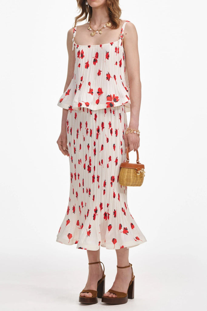 Pronta a sfoggiarsi, questa gonna midi con stampa floreale è realizzata in plissettato per una vestibilità che scolpisce il corpo. L'orlo svasato ne esalta il fascino femminile: abbinala al top e ai tacchi coordinati per un'estate sensuale.