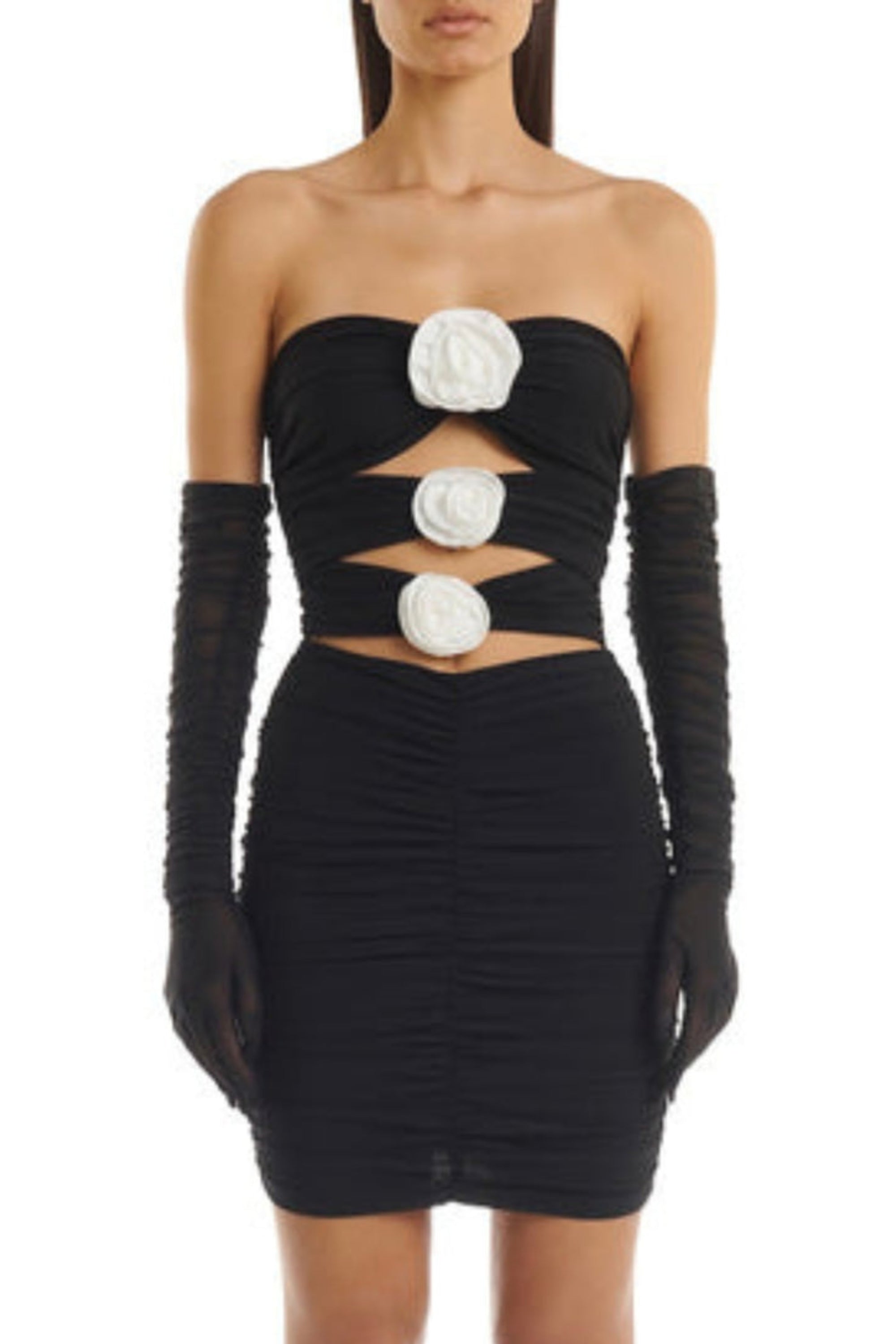 ブラックの3Dフラワーバンデージミニドレスは、ワードローブに欠かせないアイテムです。3Dフラワーのディテールが、クラシックなバンデージドレスに個性的でスタイリッシュな雰囲気を添えます。上質な素材を使用し、快適な着心地と美しいシルエットを実現。このマストハブドレスで、スタイルアップ効果を実感してください。