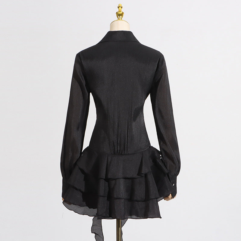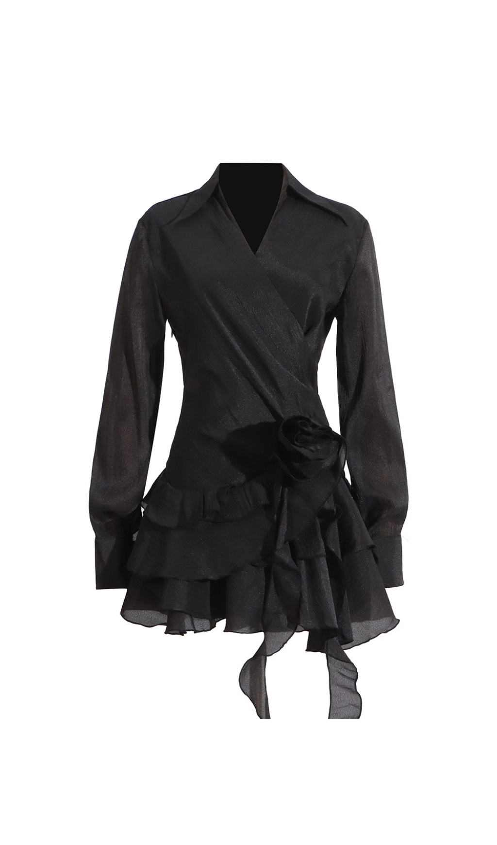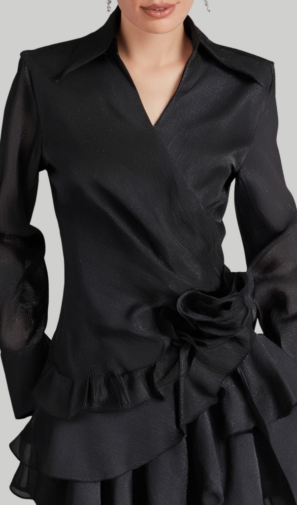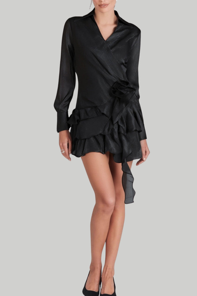 エレガントなフラワーラッフルリボンミニドレス(ブラック)で、ワードローブをワンランクアップさせましょう。繊細な花柄とチャーミングなラッフルディテールが、どんなシーンにも女性らしさを添えます。上質な素材で仕立てられたこのドレスは、きっとあなたのクローゼットの定番アイテムとなるでしょう。