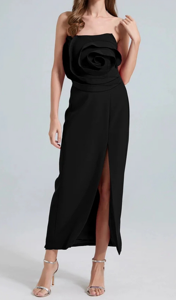 ミシェル3Dフラワーストラップレスミディドレス(ブラック)は、エレガントで洗練された雰囲気を醸し出します。精巧な3Dフラワーのディテールが、クラシックなシルエットに立体感と質感を添えています。上質な素材を使用し、どんなシーンにも快適な着心地とスタイルを約束します。