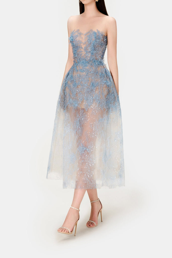 ブルーのビーズ レース ミディ ドレスは、特別な機会に最適な選択です。
