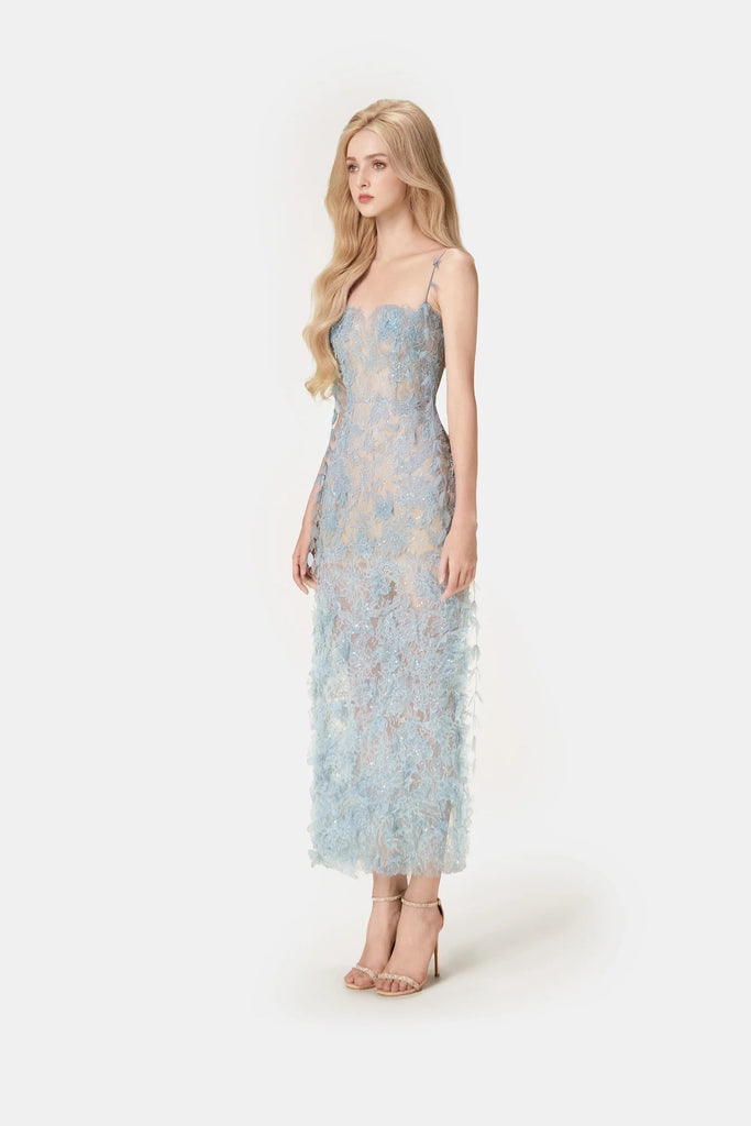 ブルーのビーズ レース ペンシル ドレスは、フォーマルな場面に最適な美しい衣服です。
