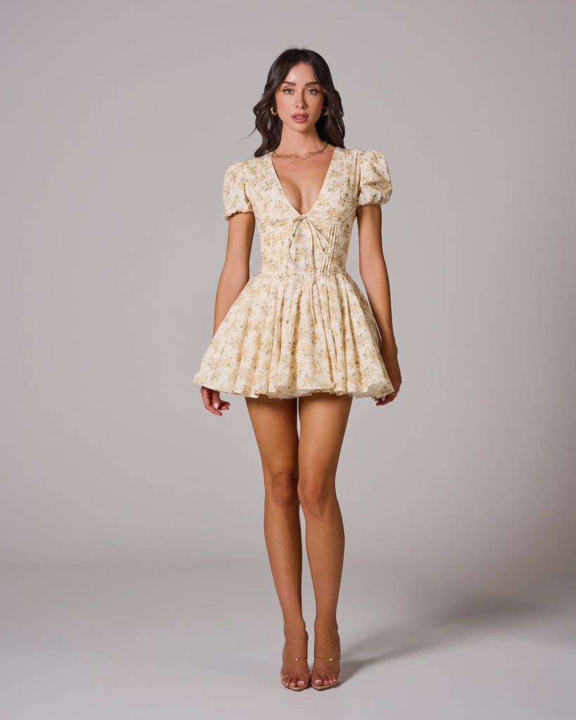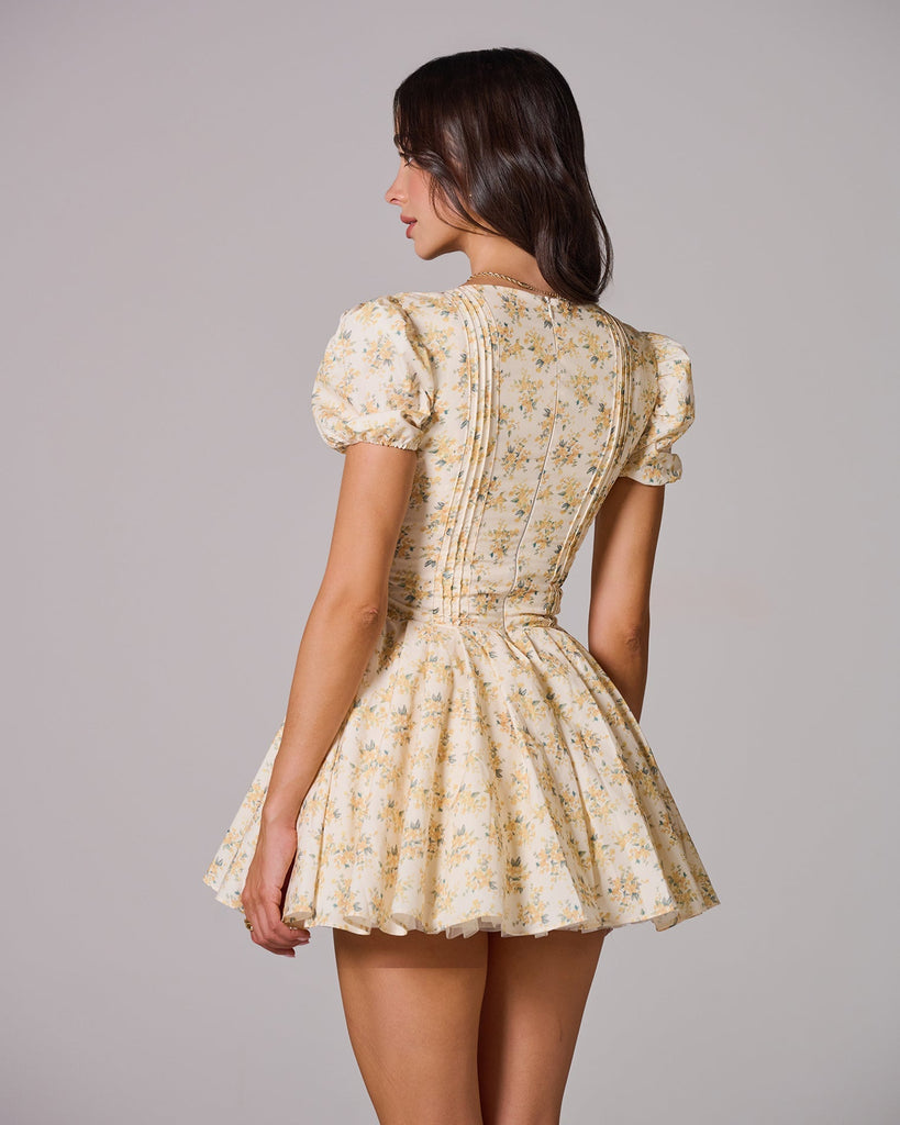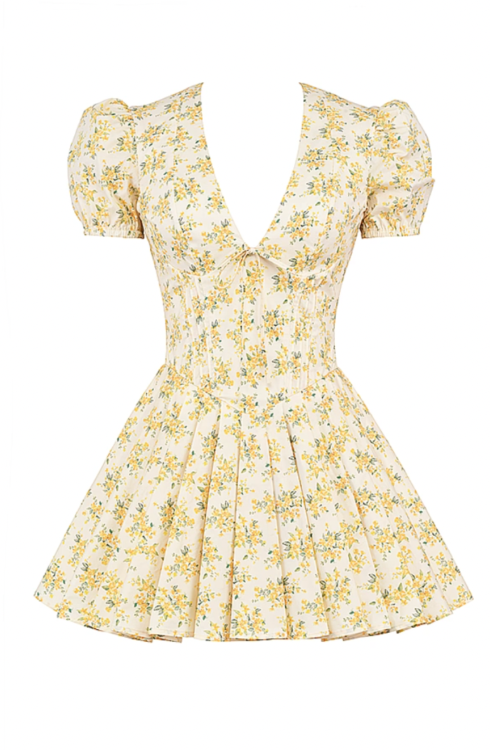 ヴィンテージフローラルプリントが美しいこの魅惑的なミニドレスは、ストレッチ入りコットン混紡素材を使用し、スタイリッシュさと快適さを両立しています。ぴったりとしたボディスと優雅なプリーツスカートが、クラシックでありながら遊び心のあるシルエットを生み出しています。