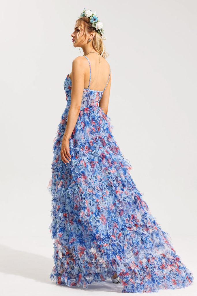 • 3D花柄、ホルターネック、フリル、マキシドレス、ブルー、ノースリーブ