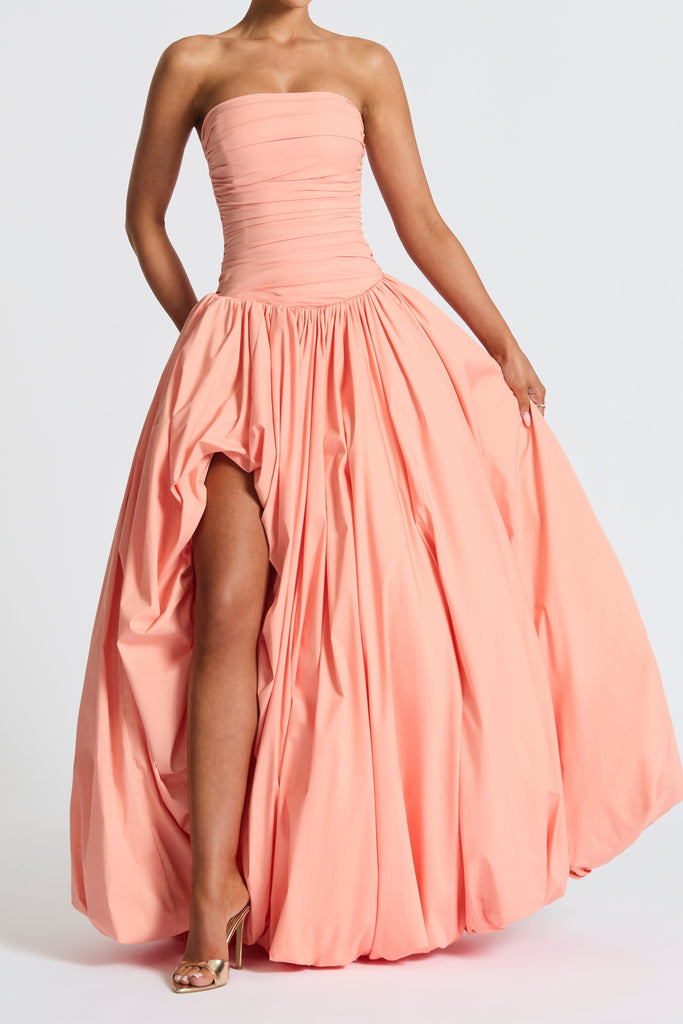 ピーチカラーのジリアン・マキシドレスで、贅沢なひとときをお過ごしください。ストラップレスのネックラインとドロップウエストが美しいシルエットを演出し、ボディスのシャーリングディテールがエレガントな雰囲気を添えます。背中のレースアップとパフボールスカートがドラマチックな雰囲気を添え、どんなシーンにもぴったりのドレスです。