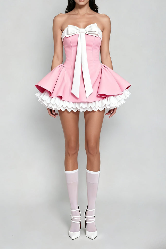 リボン編みレースのチューブトップミニドレス(ピンク)