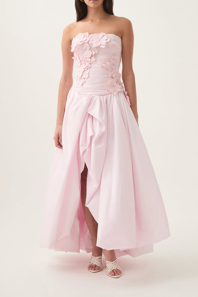 STRAPLESS FLOWER SLIT MAXI DRESS IN PINK