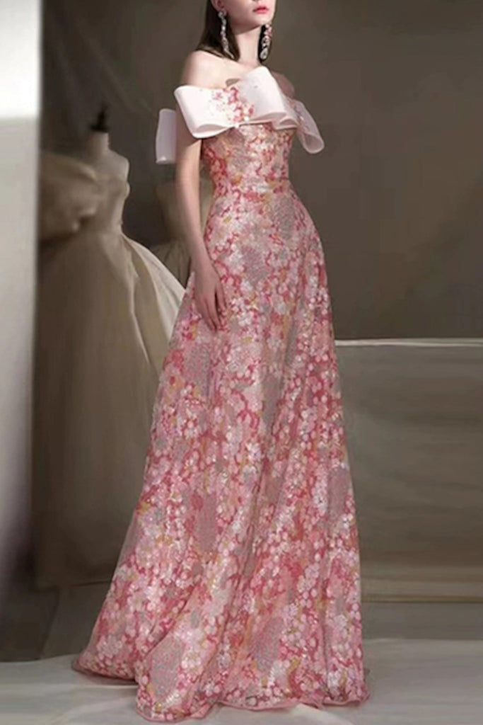 CHACHI ピンク ストラップレス フラワー 刺繍 マキシドレス