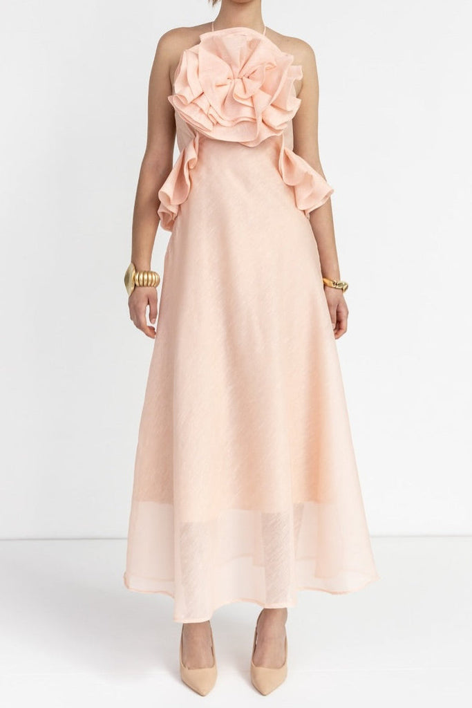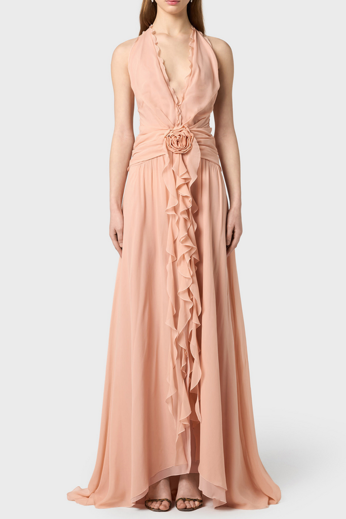 オーロラ ホルターネック ラッフル マキシドレス(ピンク)