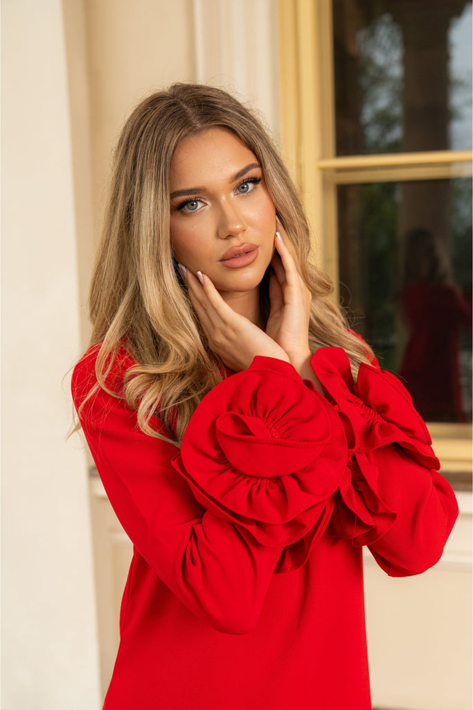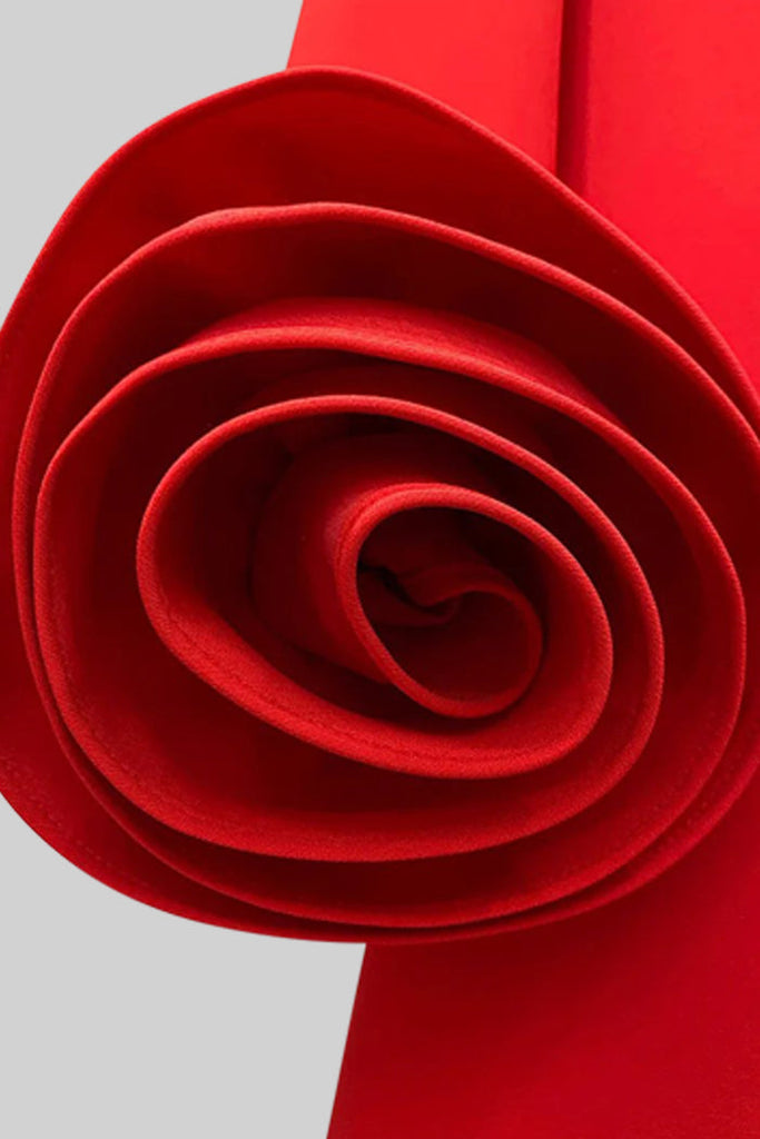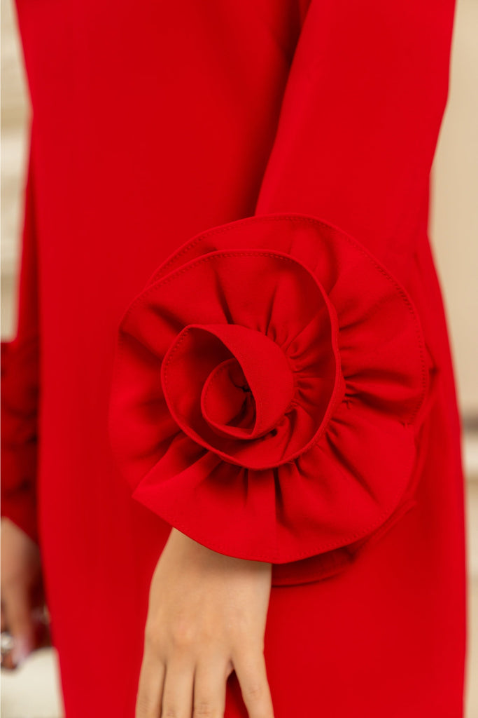 精巧に仕立てられたこの赤い長袖ミニドレスは、繊細な3Dフラワーモチーフの手首と、背中の隠しファスナーでシームレスな印象を与えます。どんなシーンにもぴったりのこのドレスは、スタイルと快適さを兼ね備え、さりげなくシックな雰囲気を演出します。