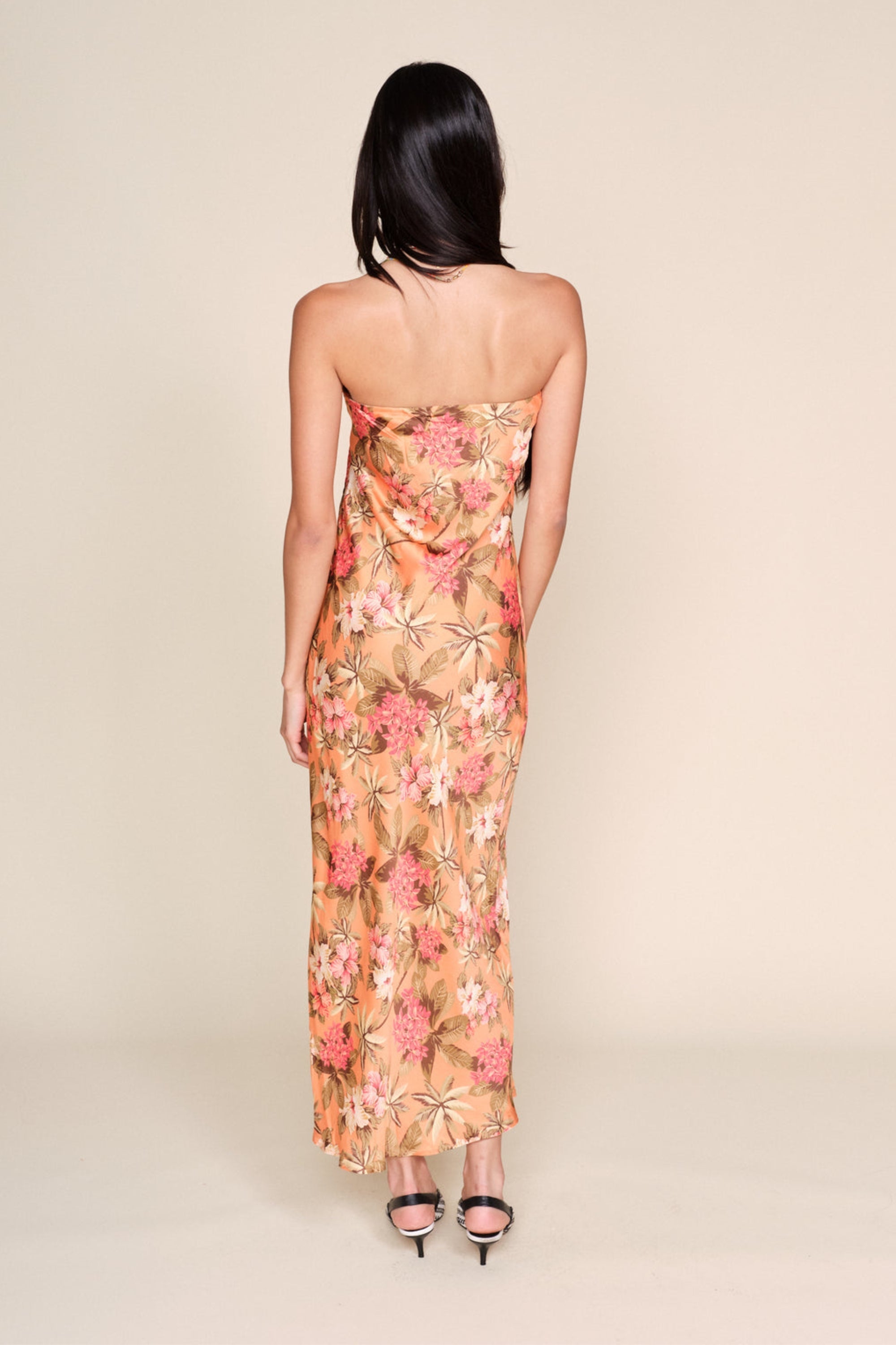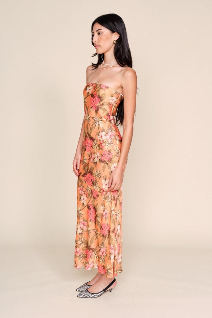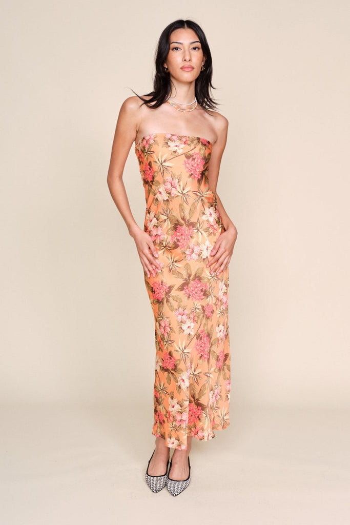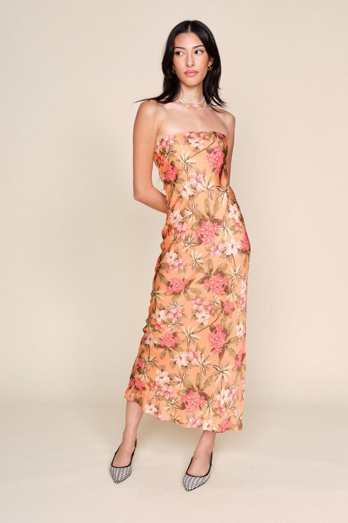 柔らかなオレンジとクリームカラーの花柄が織りなすサンセットパラダイスプリントのAdelineミディドレスは、さりげないエレガンスと洗練されたカジュアルさを融合。ストラップレスデザインは昼夜を問わず、どんなシーンにも軽やかで洗練された装いを演出します。万能なワードローブの定番アイテムとして、フォーマルなイベントにはヒール、デイタイムにはサンダルと合わせてリラックスした装いに。