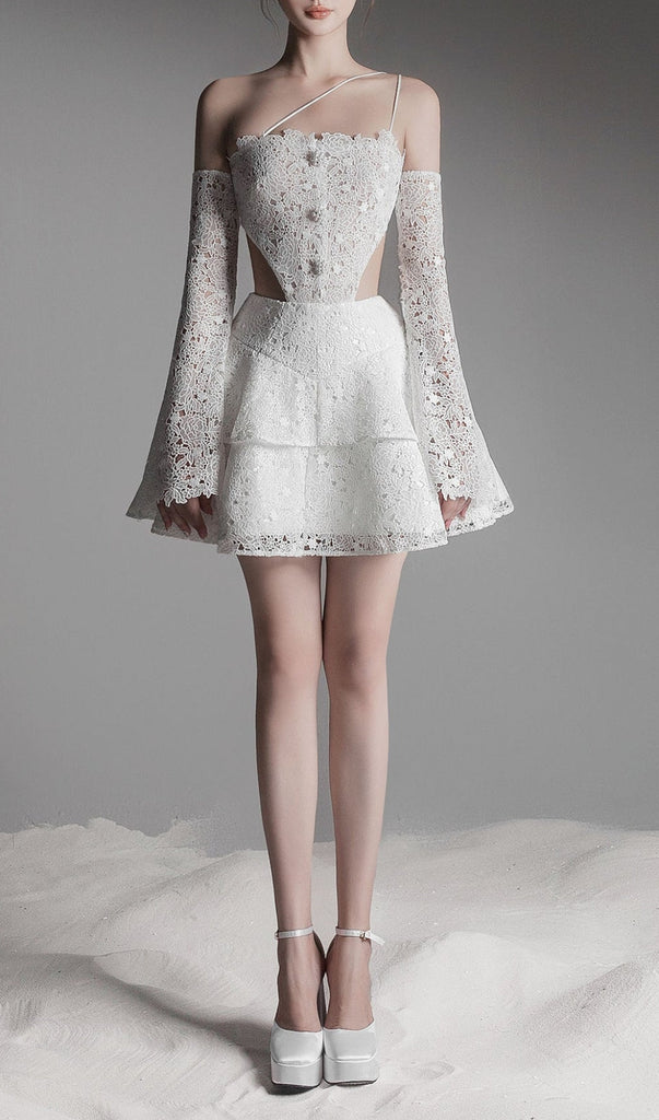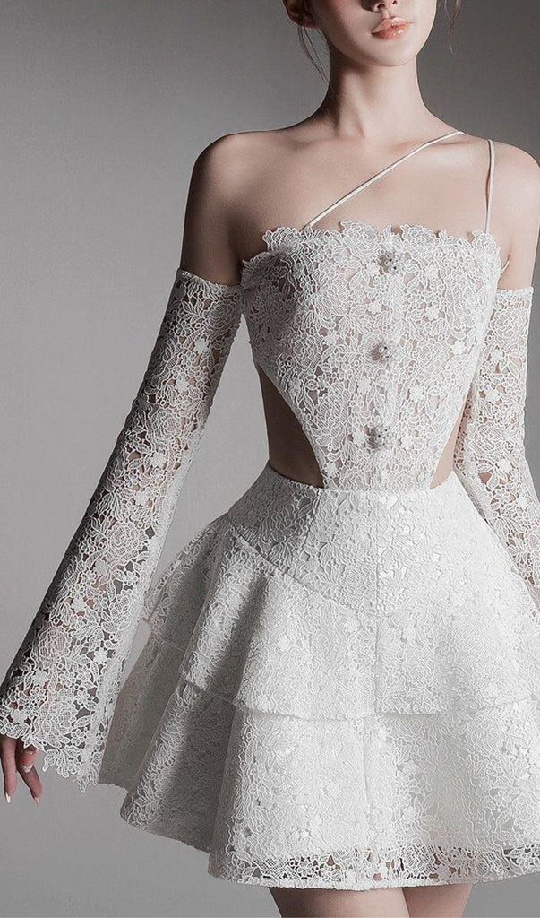 カットアウトレースのディテール、フィット&フレアシルエット、そして美しいVネックラインが特徴のエレガントなミニドレス。夜のお出かけや特別なシーンにぴったりで、きっと注目を集めること間違いなし!