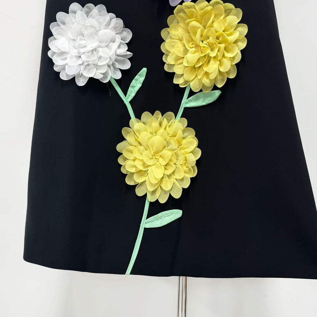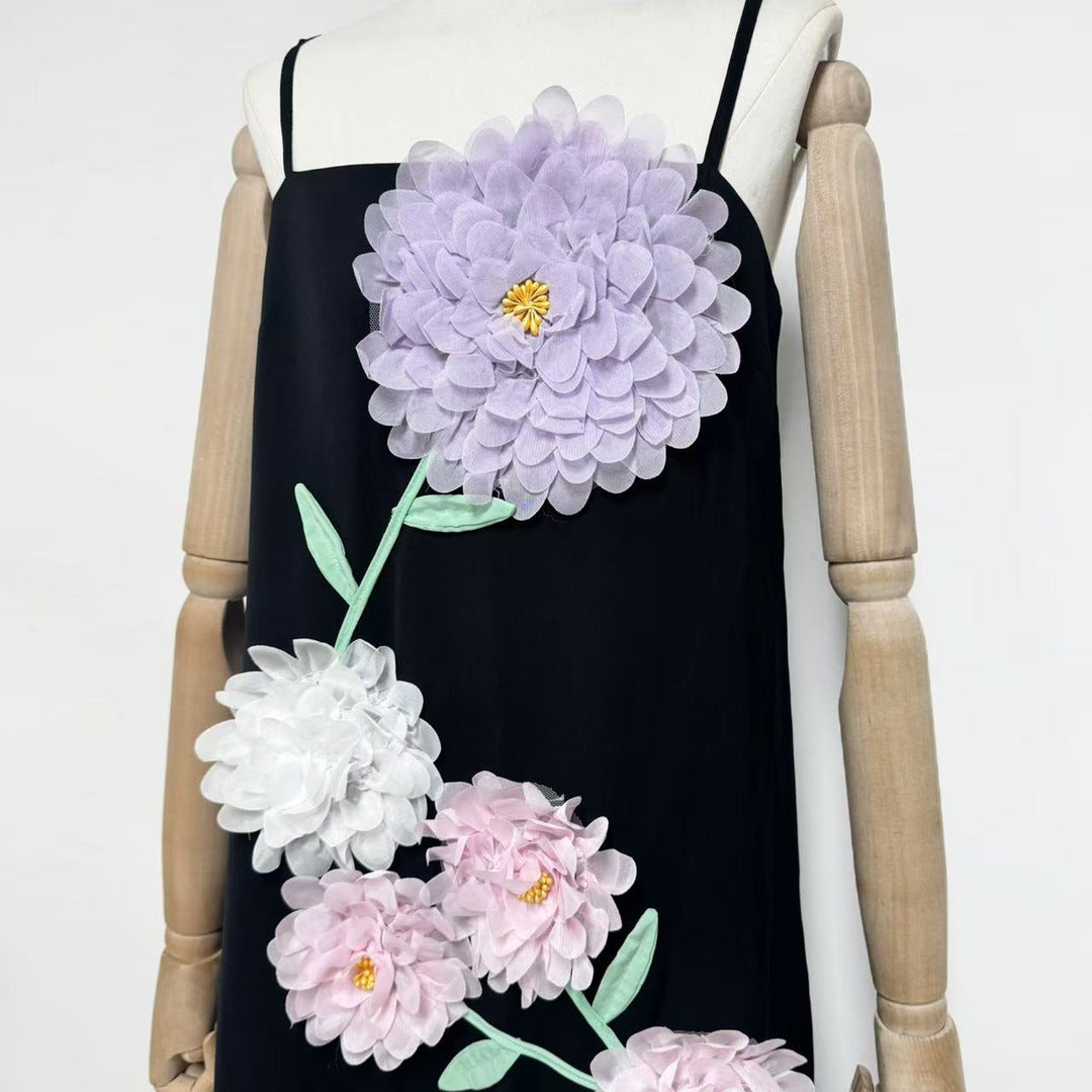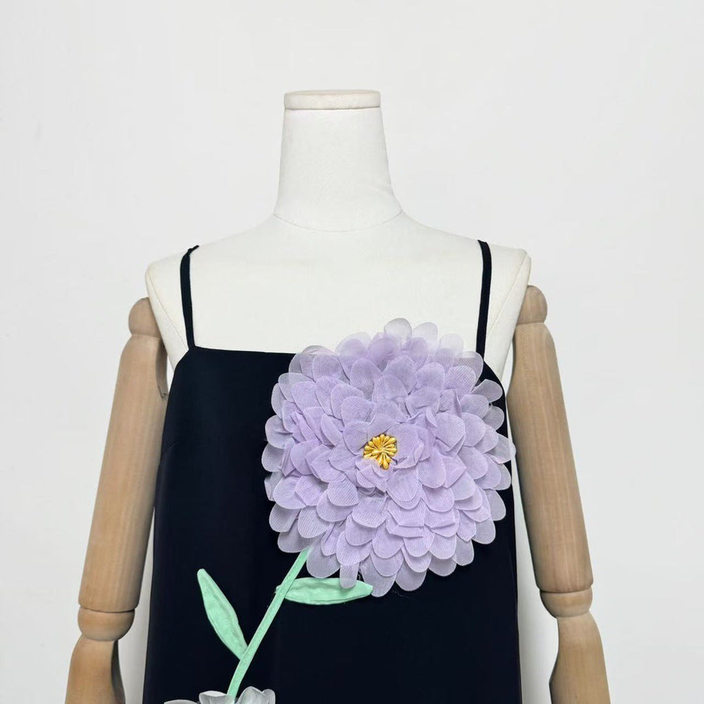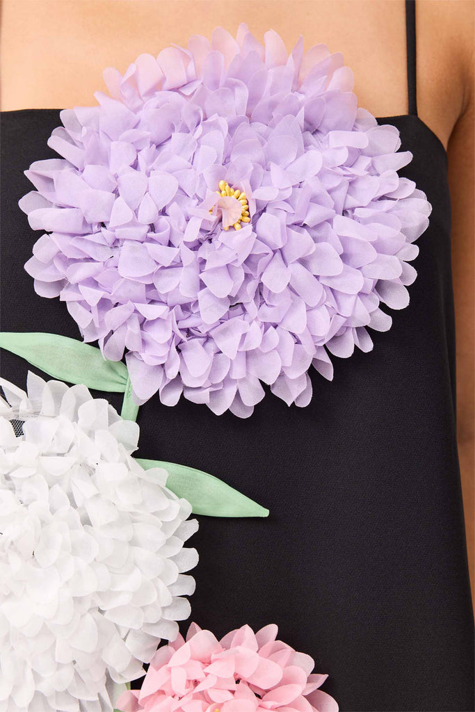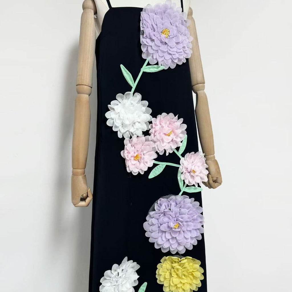 ブラックのバターカップ刺繍マキシドレスをご覧ください。洗練されたエレガンスと花の魅力が完璧なハーモニーを奏でる、目を引く一枚です。このフラワーモチーフのマキシドレスは、ボディスとスカート全体に繊細でマルチカラーの立体的な花々が繊細に散りばめられ、美しい質感と視覚的な魅力で、フォーマルなシーンを彩ります。