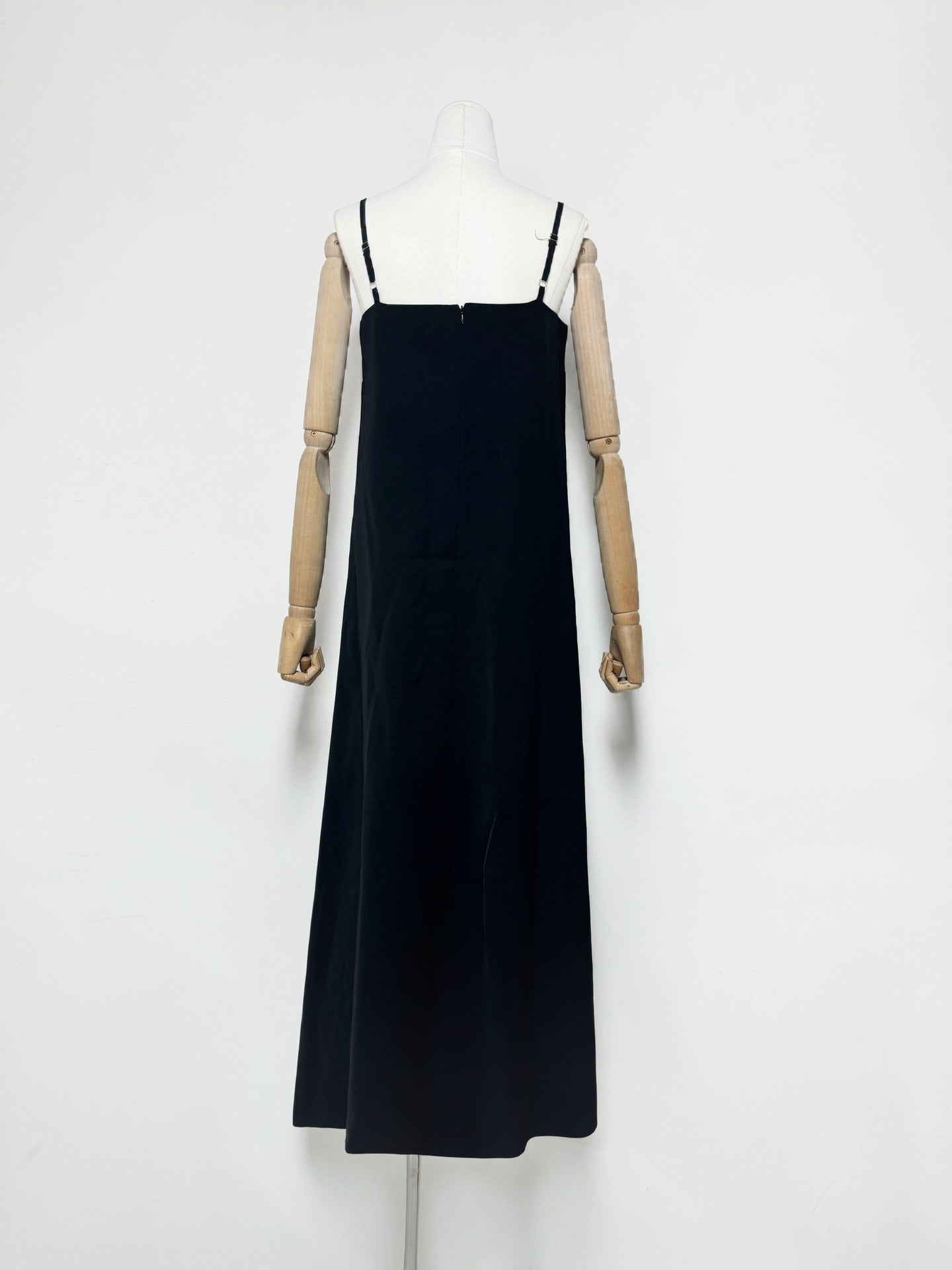 上質なスーツ生地で仕立てられたこのドレスは、テーラードシルエットを保ちながら、通気性に優れ、長時間の着用でも快適な着心地を実現しています。調節可能なストラップでフィット感をカスタマイズでき、背中中央の隠しファスナーが、どの角度から見ても滑らかですっきりとした印象を与えます。