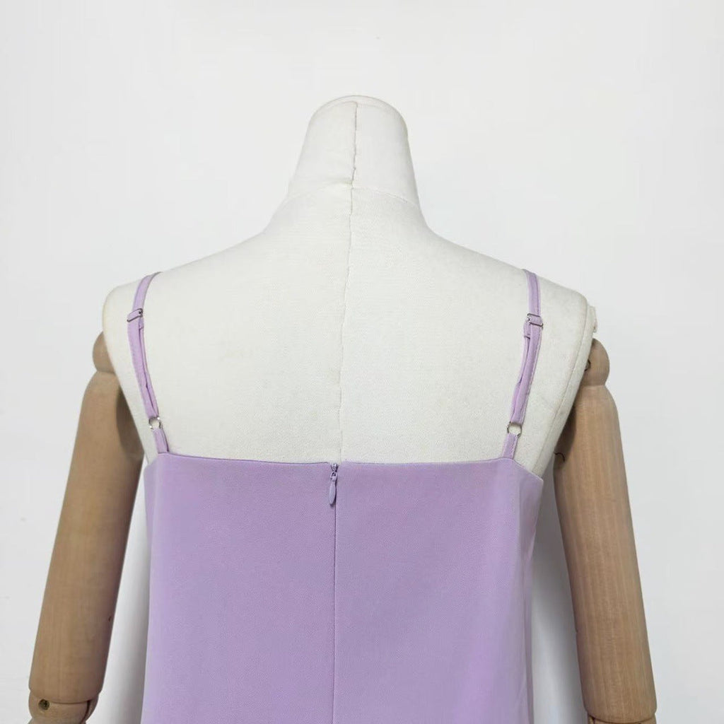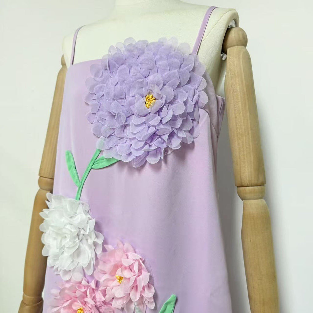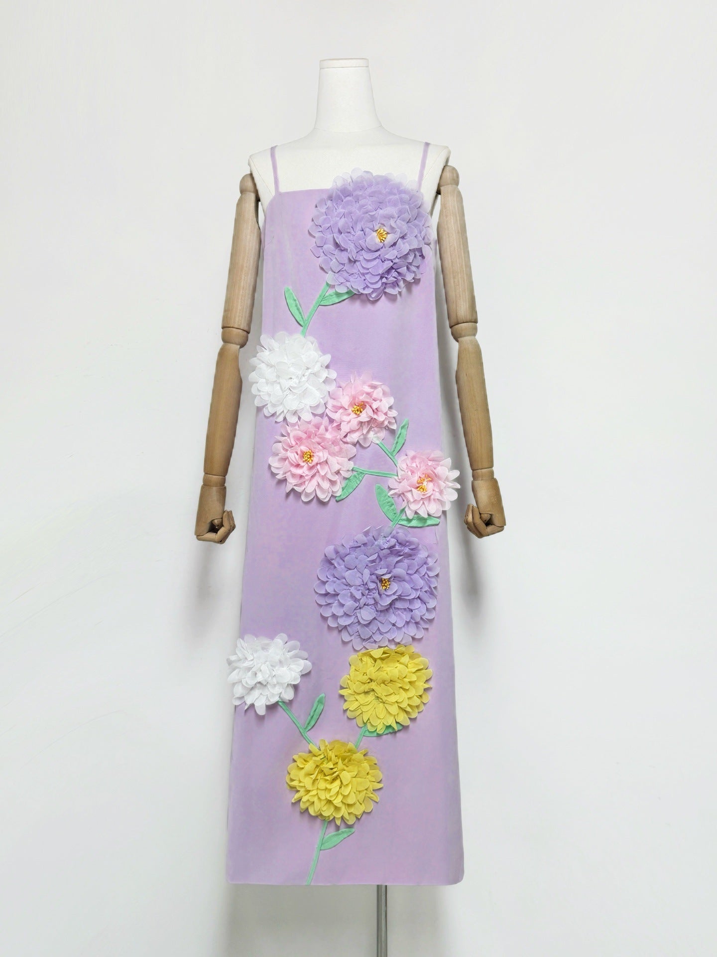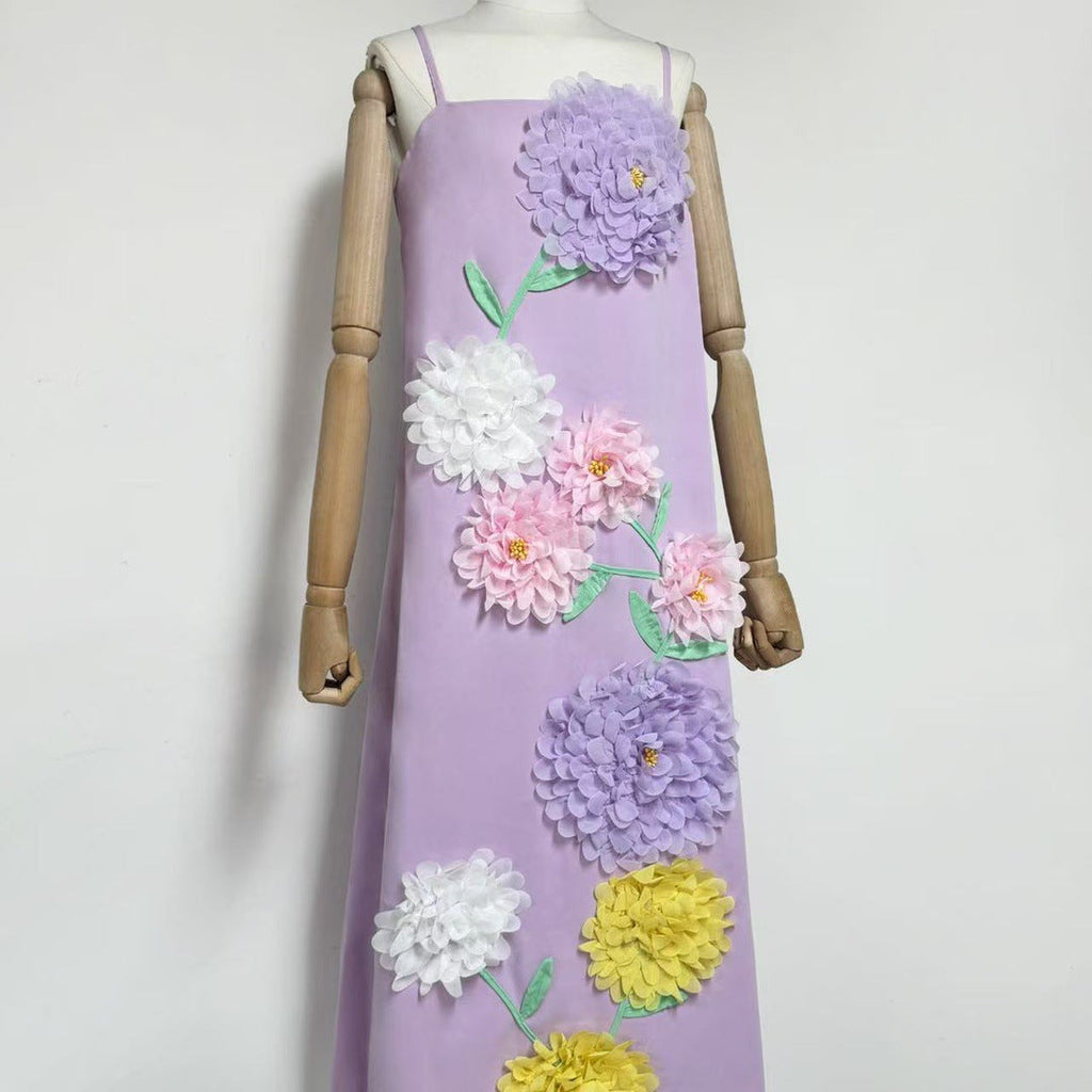 パープルのバターカップ刺繍マキシドレスは、ロマンティックなエレガンスのエッセンスを、フレッシュでモダンなひねりを加えて表現しています。遊び心のあるマルチカラーの3Dフラワー装飾で覆われたこのマキシドレスは、質感とディテールへのこだわりが光ります。柔らかなパープルの色合いが夢のような雰囲気を添え、繊細な花々が歩くたびに生き生きとした彩りを添えます。