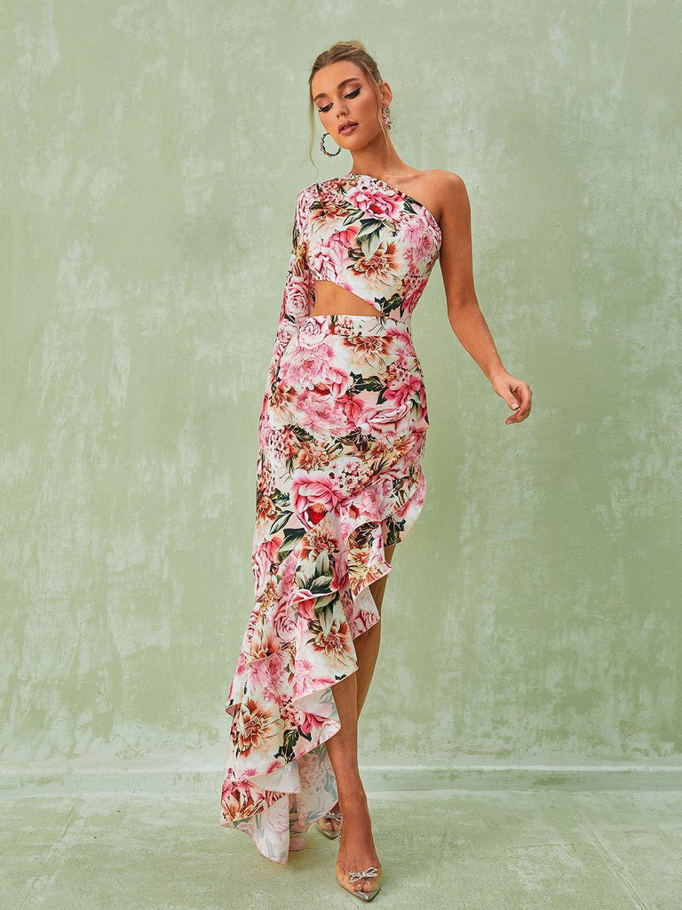 Fill the gleamy days of your autumn trip with strokes of nature's painting brush with this Aiyana One Shoulder Floral Maxi Dress In Pink from Berrylush. Land in the world of outrageous fashion with this outfit that carries an iconic element one-shoulder neckline. What more stylish could be other than the asymmetric hem that flaunts your toned legs each time you walk. The pink colour with the playful floral print is apt for your fall season trips; especially for night hangouts and fill the party night on your trip with the essence of boldness & beauty. Accessorize this outfit with heeled pumps and a cartwheel hat to complete your charming look.