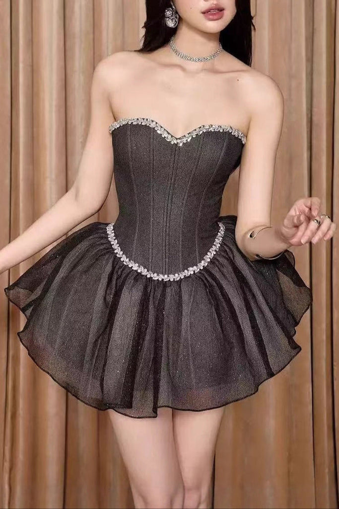 Elevate your style with the Debby Tube Top Fishbone Mesh Tulle Tutu Mini Dress in black. This expertly designed piece features a sleek tube top silhouette paired with delicate fishbone mesh overlay, adding texture and visual intrigue. The voluminous tulle tutu skirt creates a dramatic, yet sophisticated look, perfect for evening events or special occasions. Crafted for a flattering fit, this mini dress balances edgy details with feminine charm, making it a standout choice for confident, fashion-forward wearers.