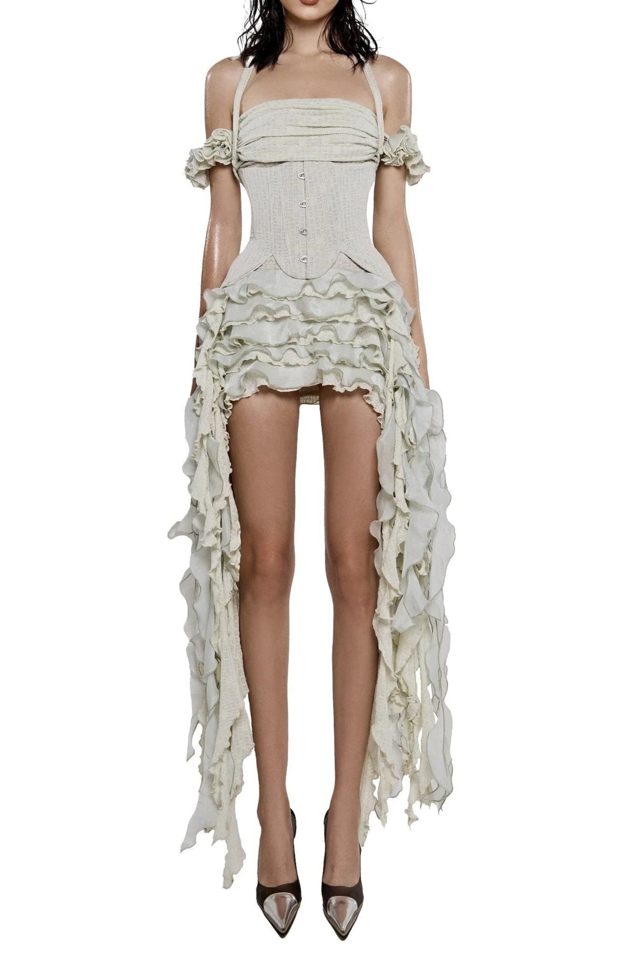 The Elva halter mini dress in beige features intricate three-dimensional floral detailing and an irregular tassel hem, combining elegance with a modern edge. Its halter neckline enhances the silhouette, making it ideal for sophisticated occasions where style and uniqueness are paramount. Crafted to offer both comfort and standout appeal, this dress is a refined choice for those seeking a distinctive yet graceful look.