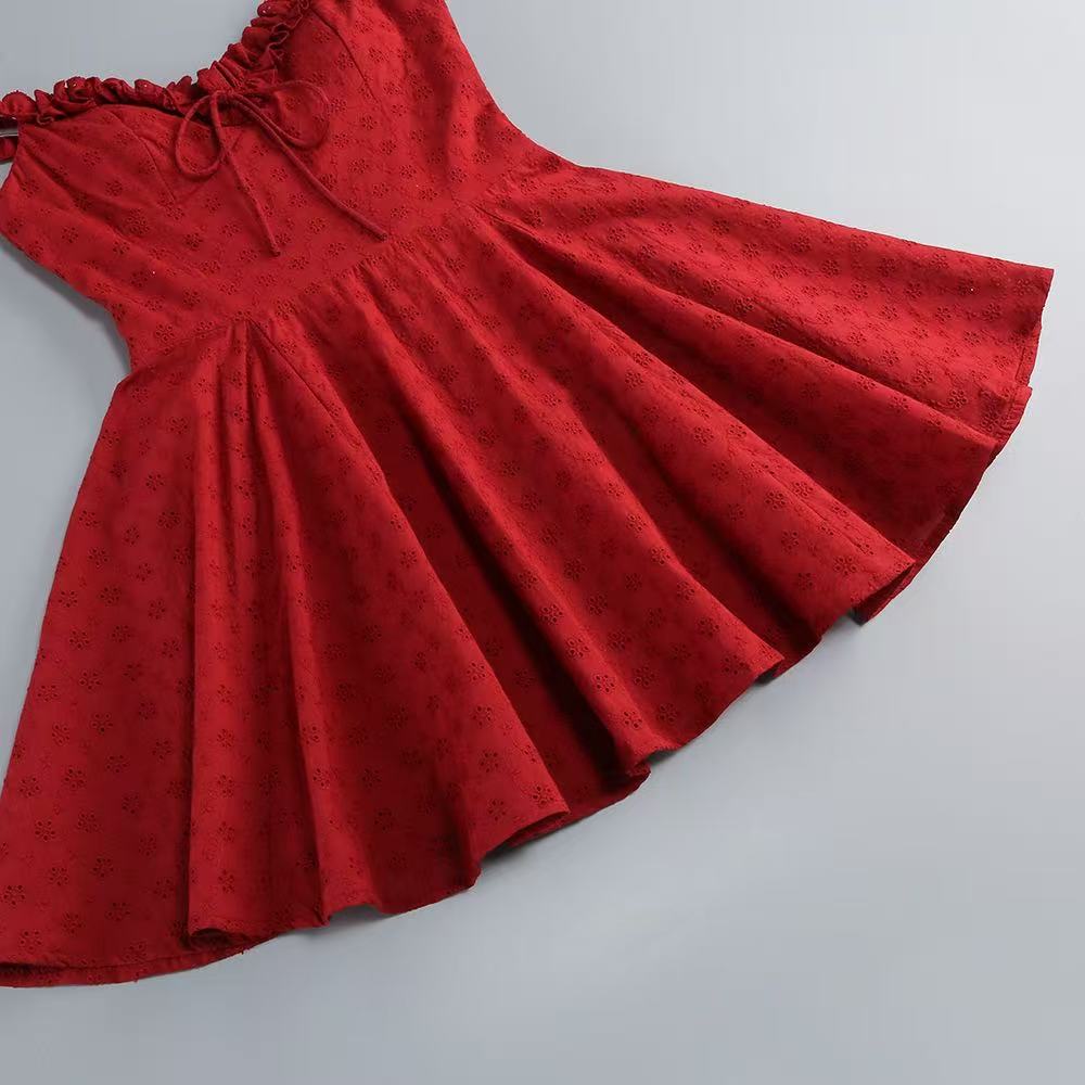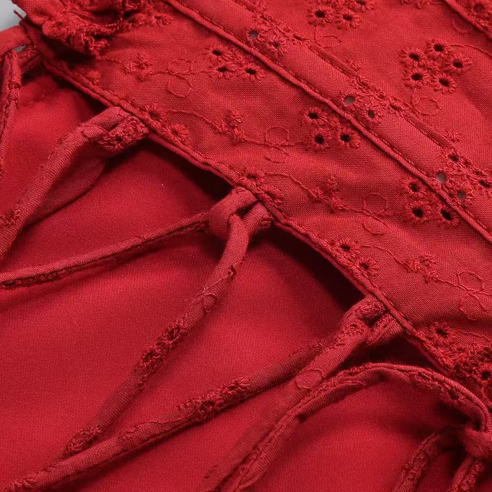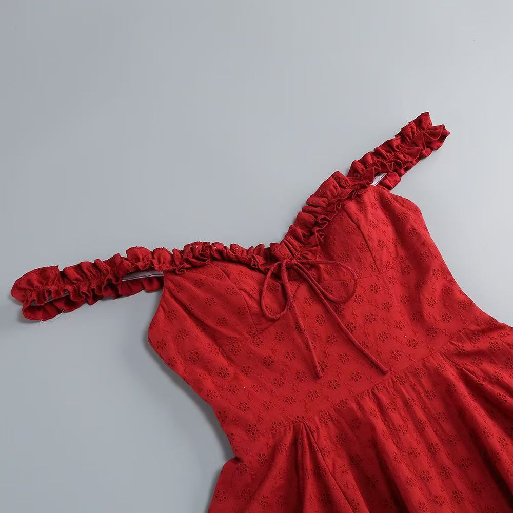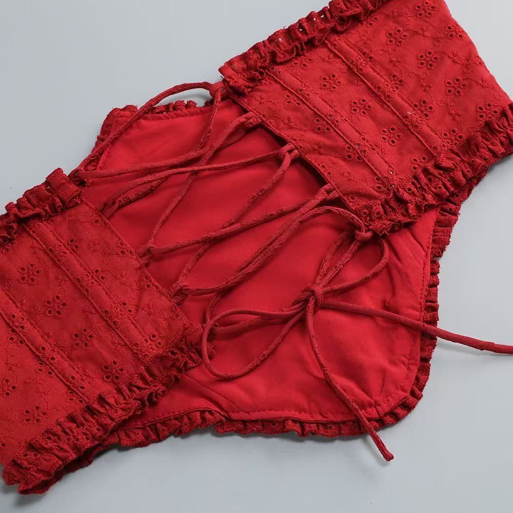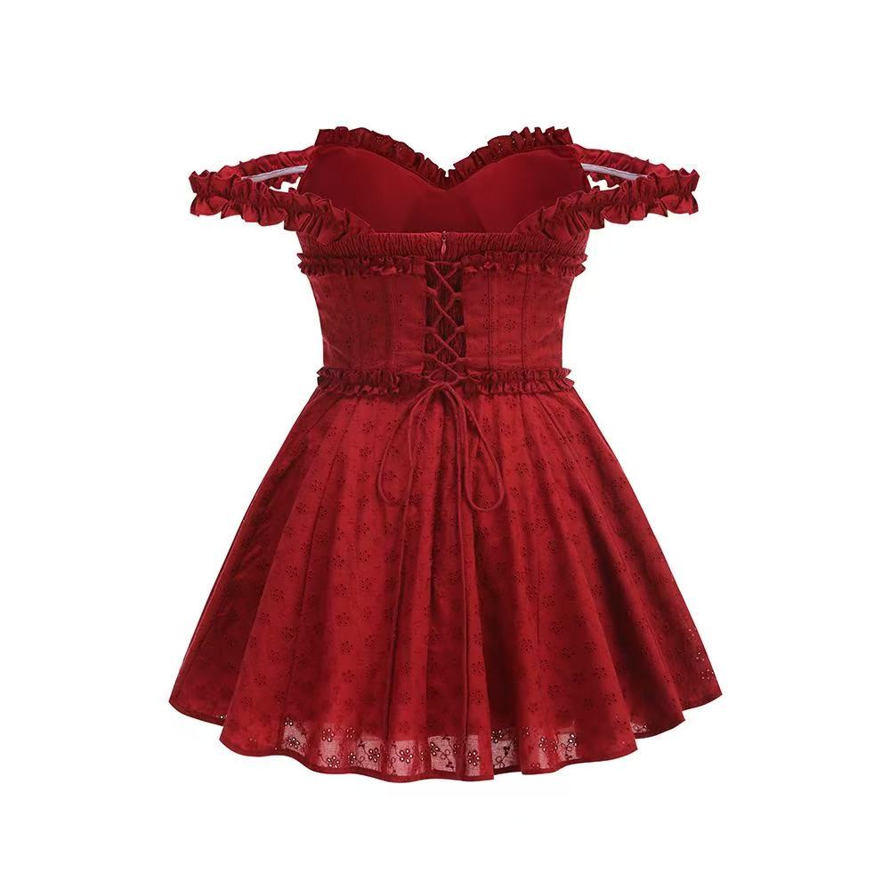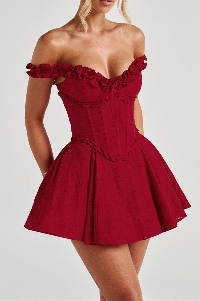 The Elva Playsuit is your go-to look for romantic evenings. This mini-length design combines comfort and elegance with its inbuilt shorts and full, flowy skirt. Made from custom broderie anglaise fabric embroidered with flowers and bows, its both sweet and sophisticated. The removable underbust corset with boning and a lace-up back adds a touch of structure and allure, while the shirred back bodice ensures a flexible fit. The elasticated ruffle straps can be styled on or off the shoulders, offering versatility. The bust is finished with a tie, while the skirt has godet inserts with tulle lining for extra volume.