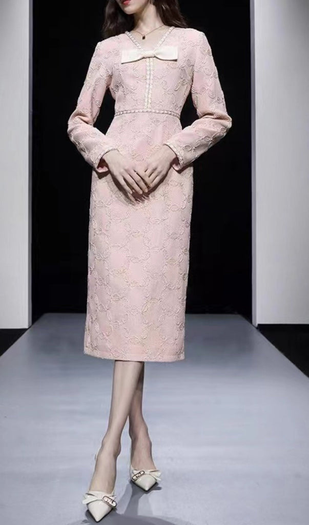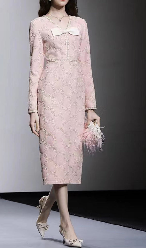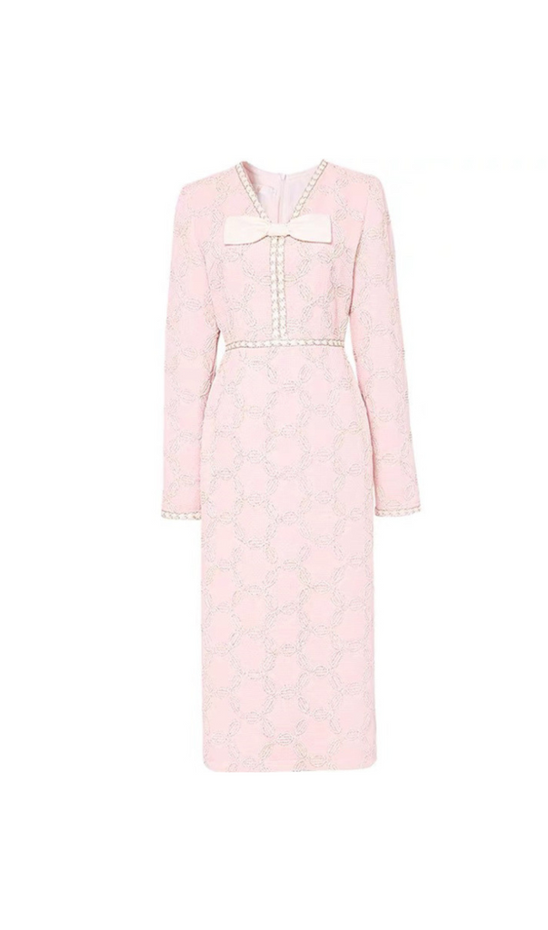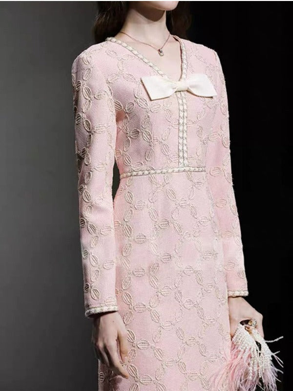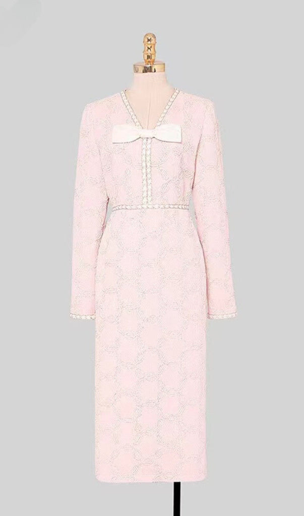 Expertly crafted with delicate embroidery, this midi dress features a flattering V-neck and elegant bow detail. The perfect blend of style and sophistication, it is sure to make a statement at any event.