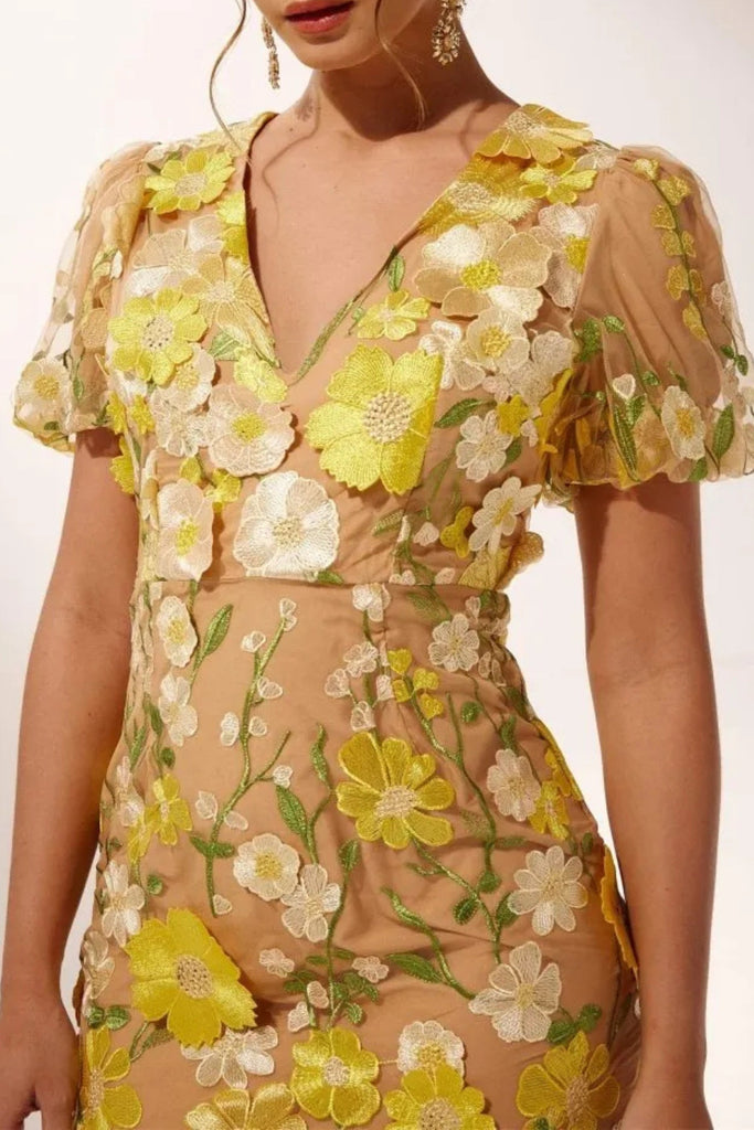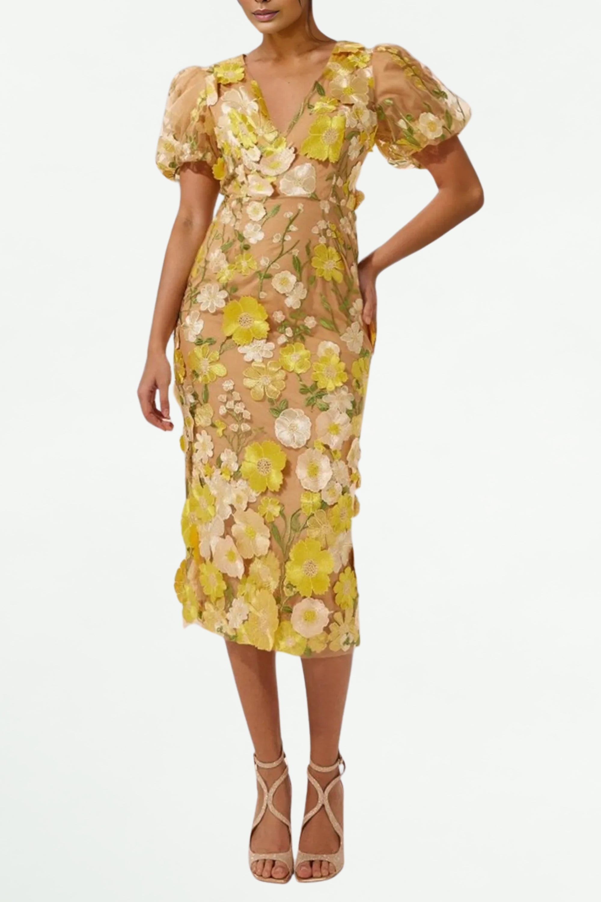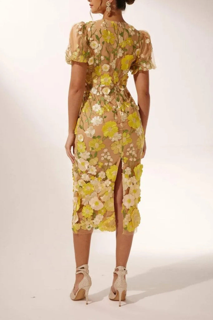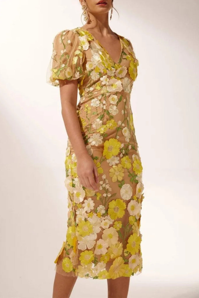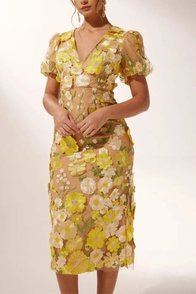 EREEN PUFF SLEEVES V-NECK FLOWER MIDI DRESS – Wildnora.com