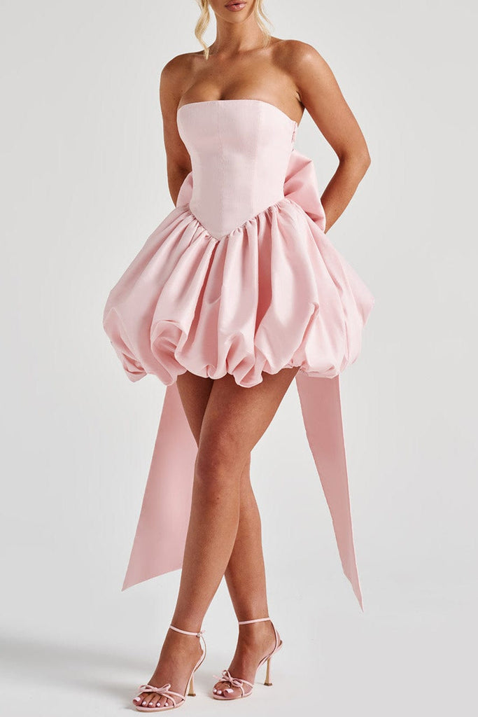 Steal the show in our Lotus mini dress. Crafted from premium textured taffeta fabric, this mini has been designed for maximum drama. This strapless masterpiece features a bold puff-ball skirt with delicate gathering at the waist, creating a voluminous and eye-catching silhouette. The V-shaped waist seam, boned bodice and lace up back ensure a sculpted, flattering fit. Lotus is complete with detachable bow with long, sweeping tails adding a statement-making touch that can be removed to switch up your look.