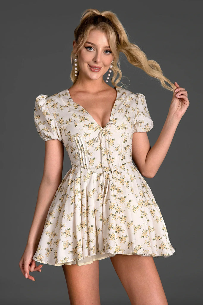 Exude charm in our v-neck floral mini dress. This enchanting dress features a flattering V-neckline and a playful mini length, perfect for showcasing your legs. Adorned with a beautiful floral pattern, it exudes a fresh and vibrant appeal. Ideal for garden parties, brunches, or any casual outing where you want to feel effortlessly stylish.
